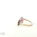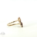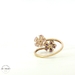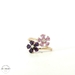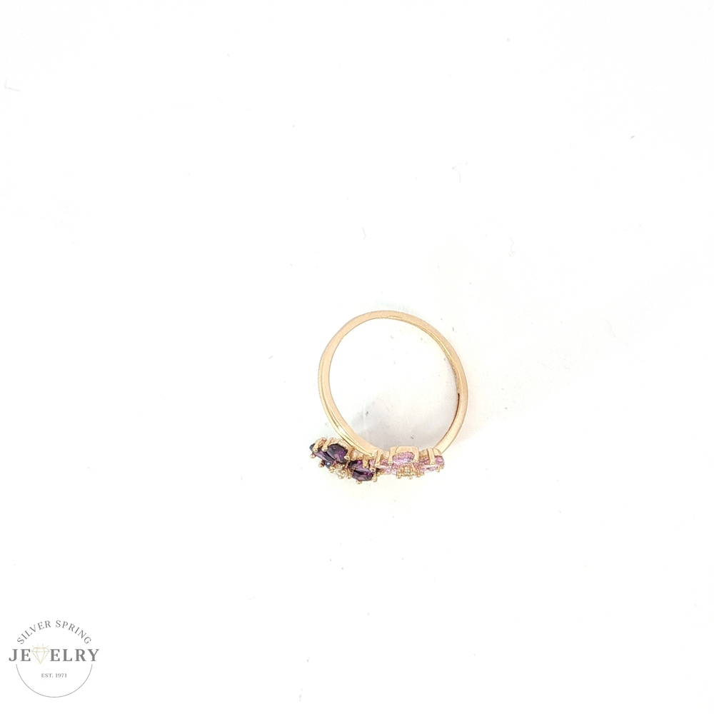 This exquisite size 8, 14K yellow gold bypass ring weighs 2.3g and features two beautifully crafted flowers. One flower boasts a vibrant purple cubic zirconia (CZ), while the other is adorned with a stunning pink CZ. Bypass rings are known for their unique, eye-catching designs that wrap around the finger, and this ring is no exception. It is a striking piece that perfectly blends elegance and whimsy, making it a standout addition to any jewelry collection.