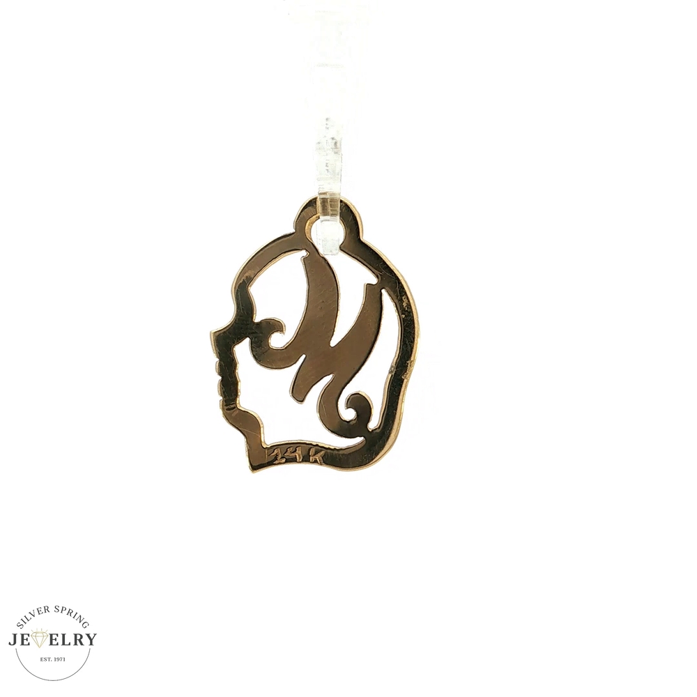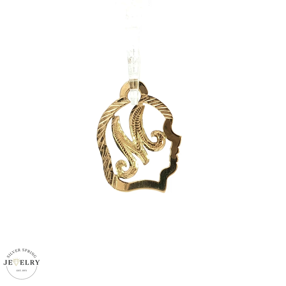 Looking for classic elegance? This beautifully crafted 14kt yellow gold pendant is the perfect choice. Weighing 1.5 grs, it features a delicate, intricately detailed girl's side profile. A prominent M initial, centered on the pendant, adds a personal touch. This pendant is not only a fine piece of jewelry but also a symbol of identity, making it the perfect gift for someone special or a treat for yourself.