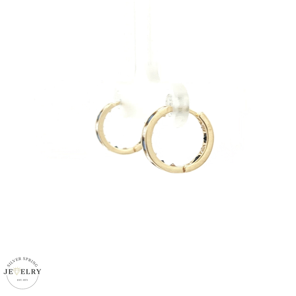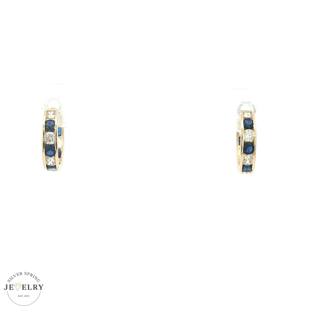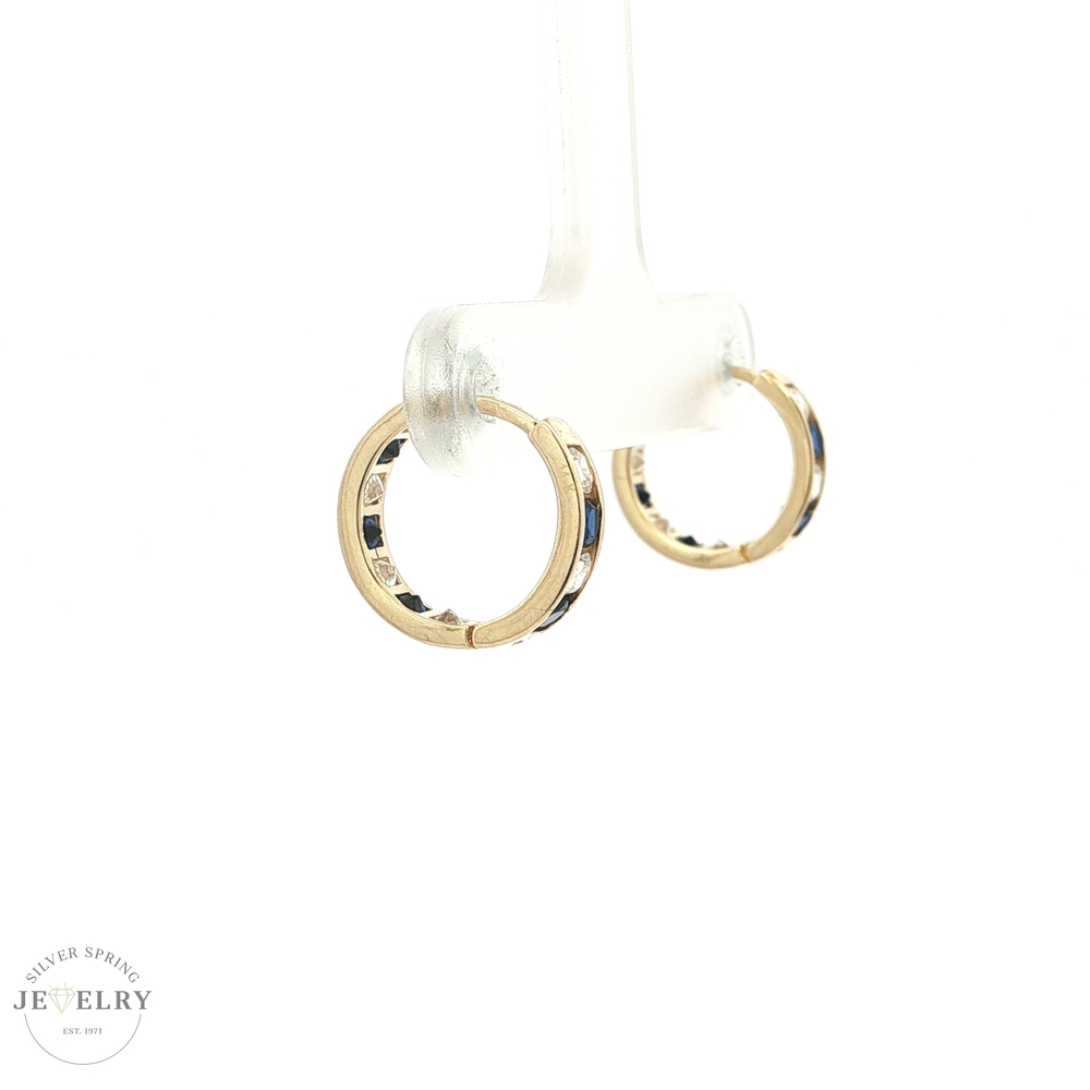 Elevate any look with these 14K yellow gold huggie earrings. Adorned with an alternating pattern of blue and clear cubic zirconia stones, they offer a delightful sparkle that's hard to ignore. Each earring is embellished with a total of 10 stones, carefully set to catch the light from every angle. Weighing a comfortable 1.5 grams, these earrings seamlessly blend style, elegance, and practicality, making them an essential addition to any jewelry collection. They are designed to be universally flattering, fitting seamlessly into any wardrobe or style.