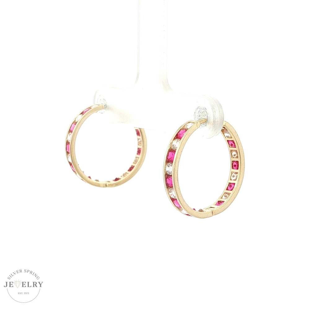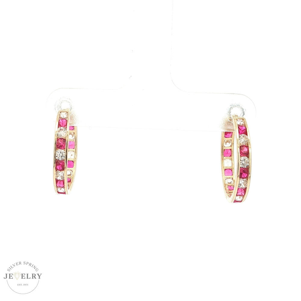 Illuminate your look with these 14K yellow gold huggie earrings, beautifully accentuated with a dazzling pattern of clear and red cubic zirconias. Each earring boasts 10 sparkling stones, flawlessly set to shimmer elegantly with every move. Weighing 2.6 grams, these earrings exude a modest charm that is both elegant and timeless. Featured in a classic design, these huggie earrings offer enduring beauty and style. Perfect for everyday wear or special occasions, they are an exquisite addition to any jewelry collection.
