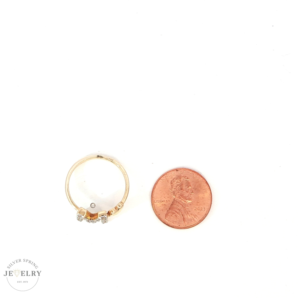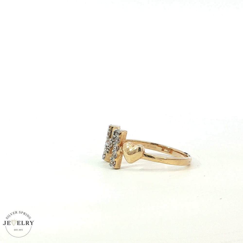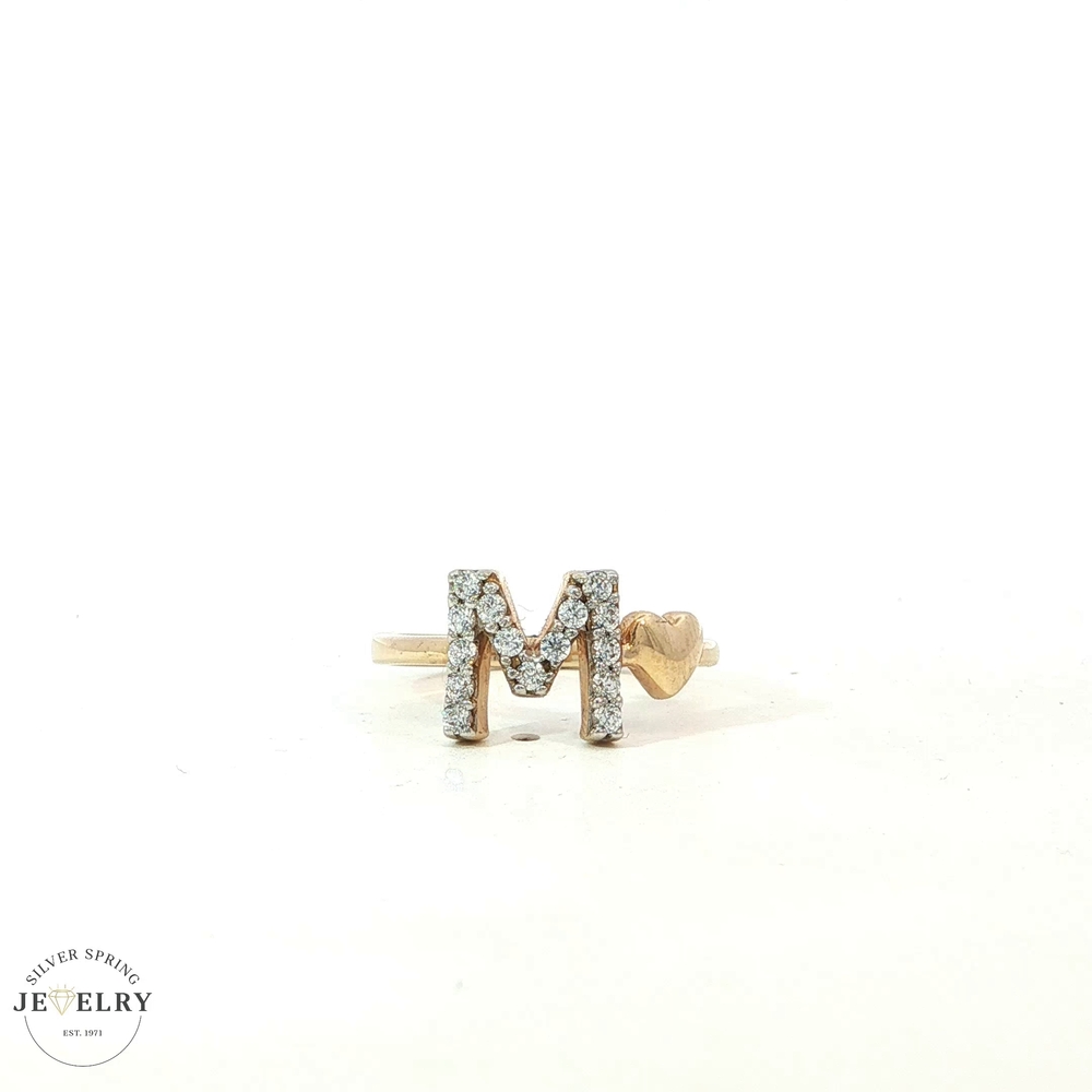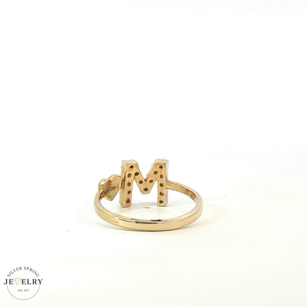 This exquisite ring is composed of 14 karat yellow gold, weighing 2.90 grams, showcasing a brilliant Cubic Zirconia stone, tastefully designed in the shape of an 'M.' The ring is a Size 7, making it a perfect fit for many. Yellow gold adds a classic touch, while the CZ 'M' adds uniqueness, giving off a radiant shine that is sure to impress. This could be a great pick for personal adornment or as a gift for someone special.