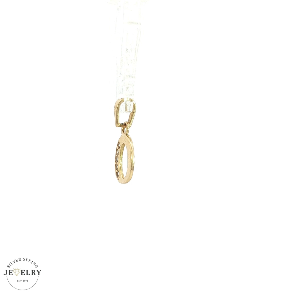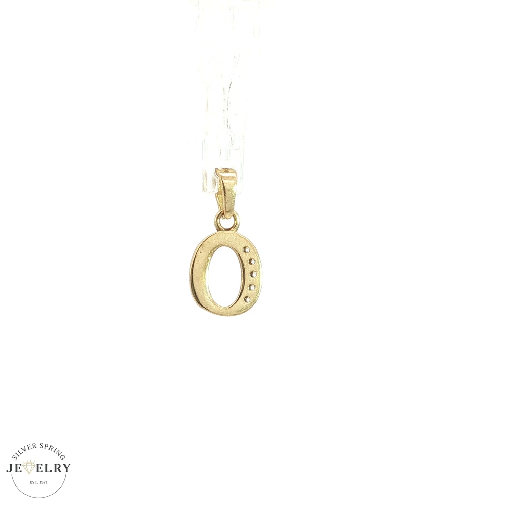 This 14kt yellow gold pendant features an initial O design and weighs approximately 0.60 grams. It is elegantly accented with sparkling cubic zirconia stones, adding brilliance and charm. Perfect for personalizing jewelry collections or gifting, this delicate piece combines quality craftsmanship with timeless style. Ideal for everyday wear or special occasions, it offers a subtle yet meaningful statement.