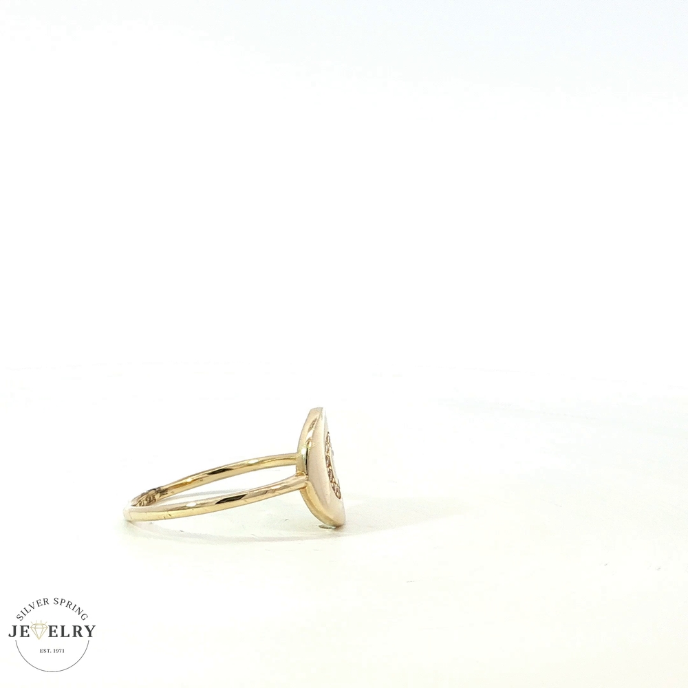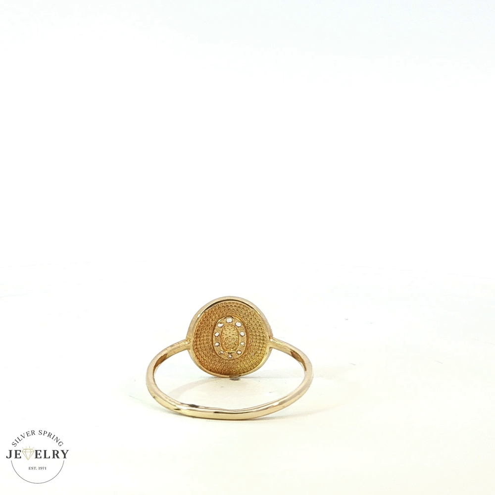 Presenting a refined and timeless piece, an 'O' initial ring crafted from 14k yellow gold. This exquisite ring, strikingly adorned with glittering cubic zirconia stones, adds a rich sparkle and sophistication. Weighing a minimal 2 grams, the ring is light, adding a comfortable grace to your daily wear. It's designed to fit perfectly with a ring size of 8.50. This classic 'O' initial ring is a unique piece of personalized jewelry, perfect for your collection or to gift someone special.