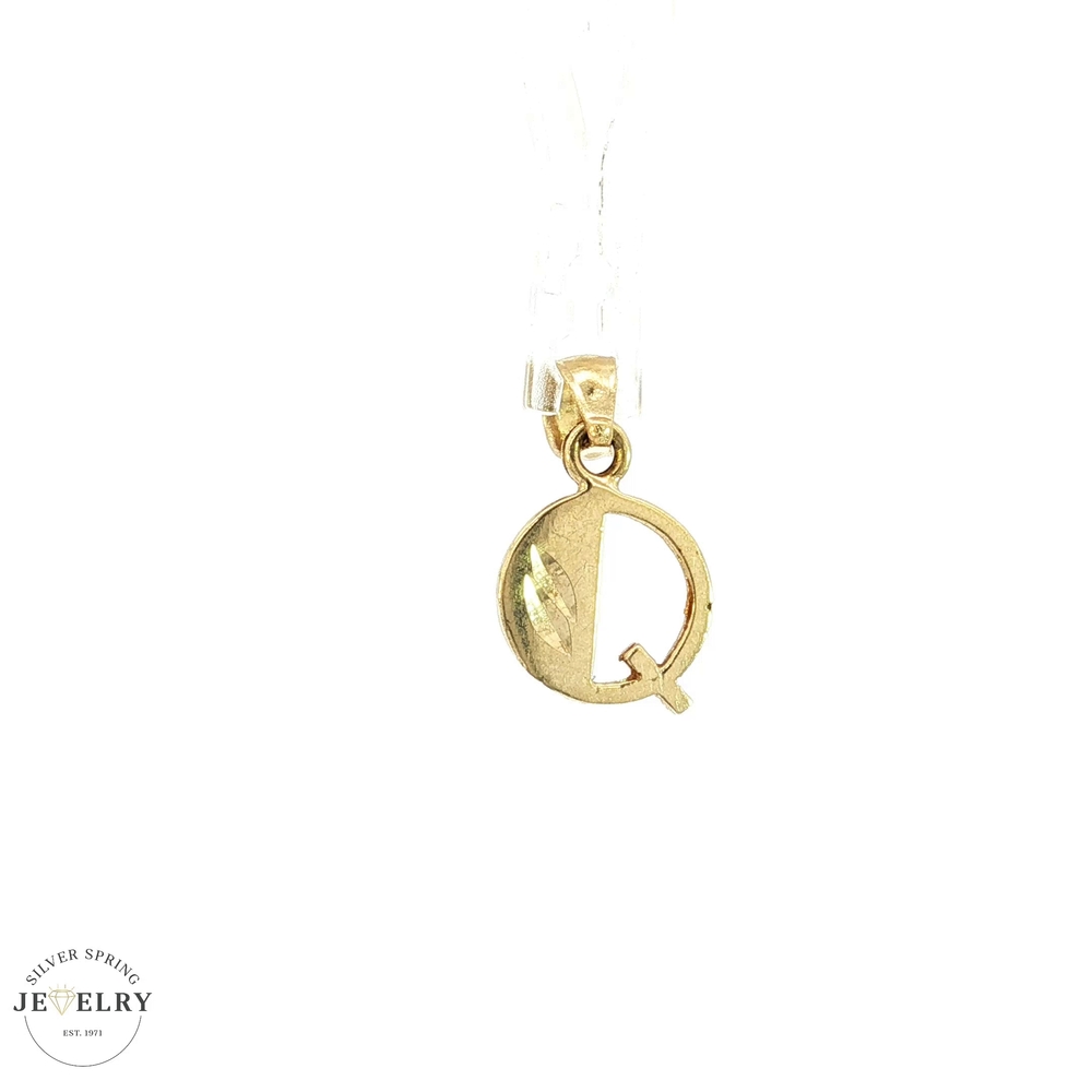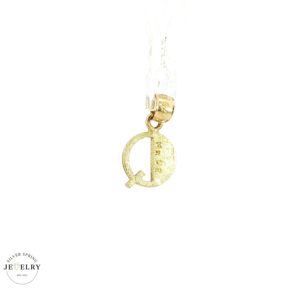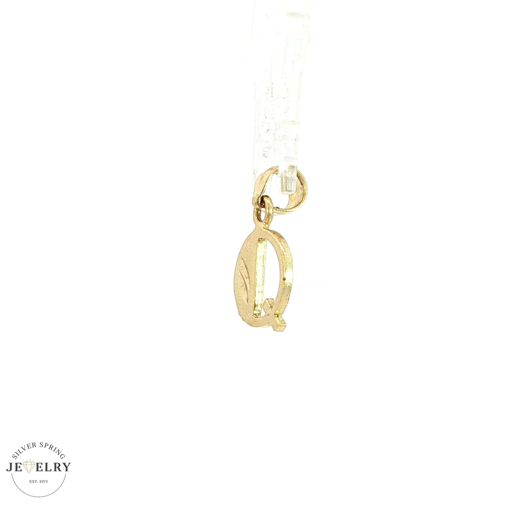 This 14kt yellow gold pendant, weighing 0.80 grams, features a delicate initial Q design. Crafted from durable 14-karat gold, it offers a beautiful, lasting shine and subtle elegance. Its lightweight construction makes it perfect for everyday wear or layering with other necklaces, combining personalization with timeless style.