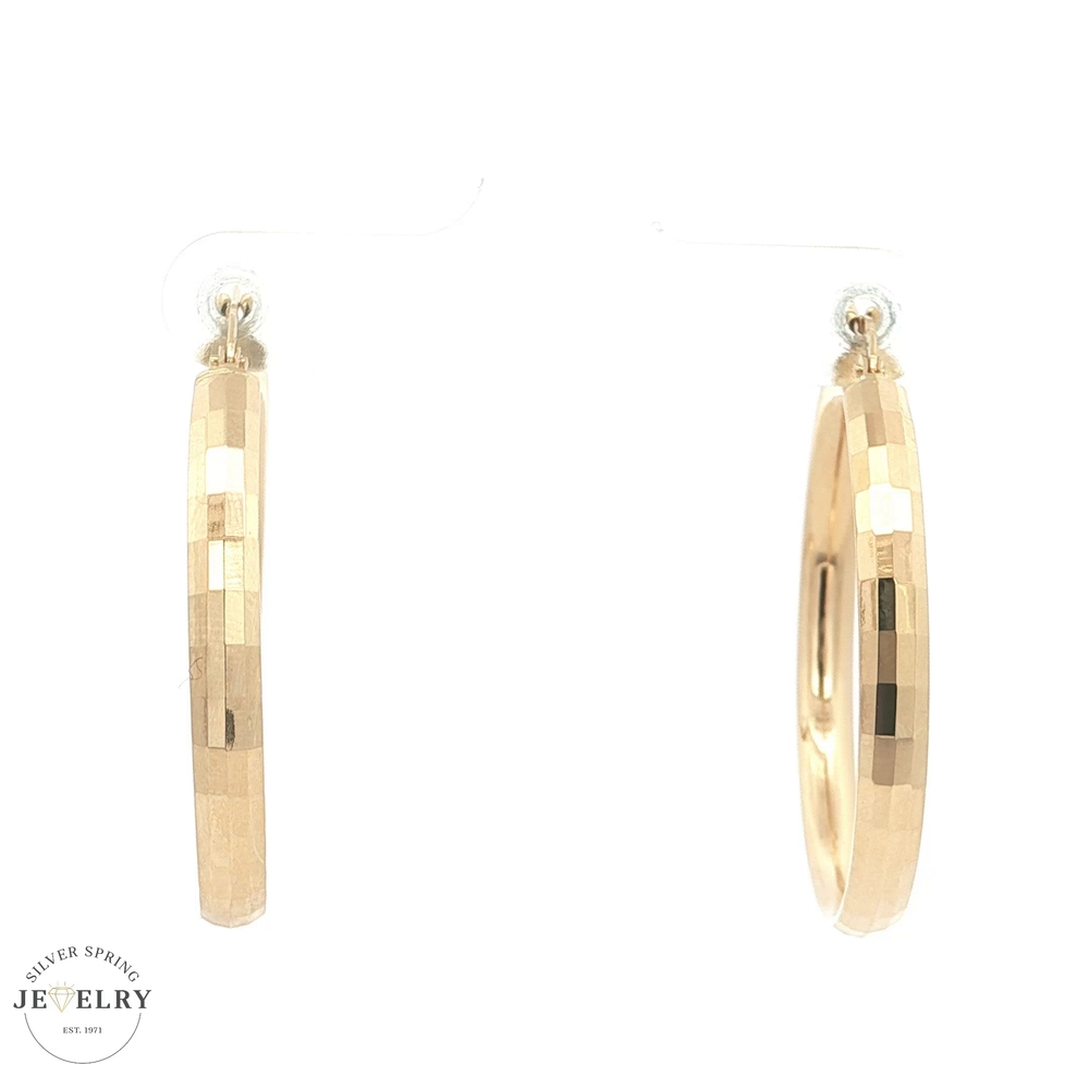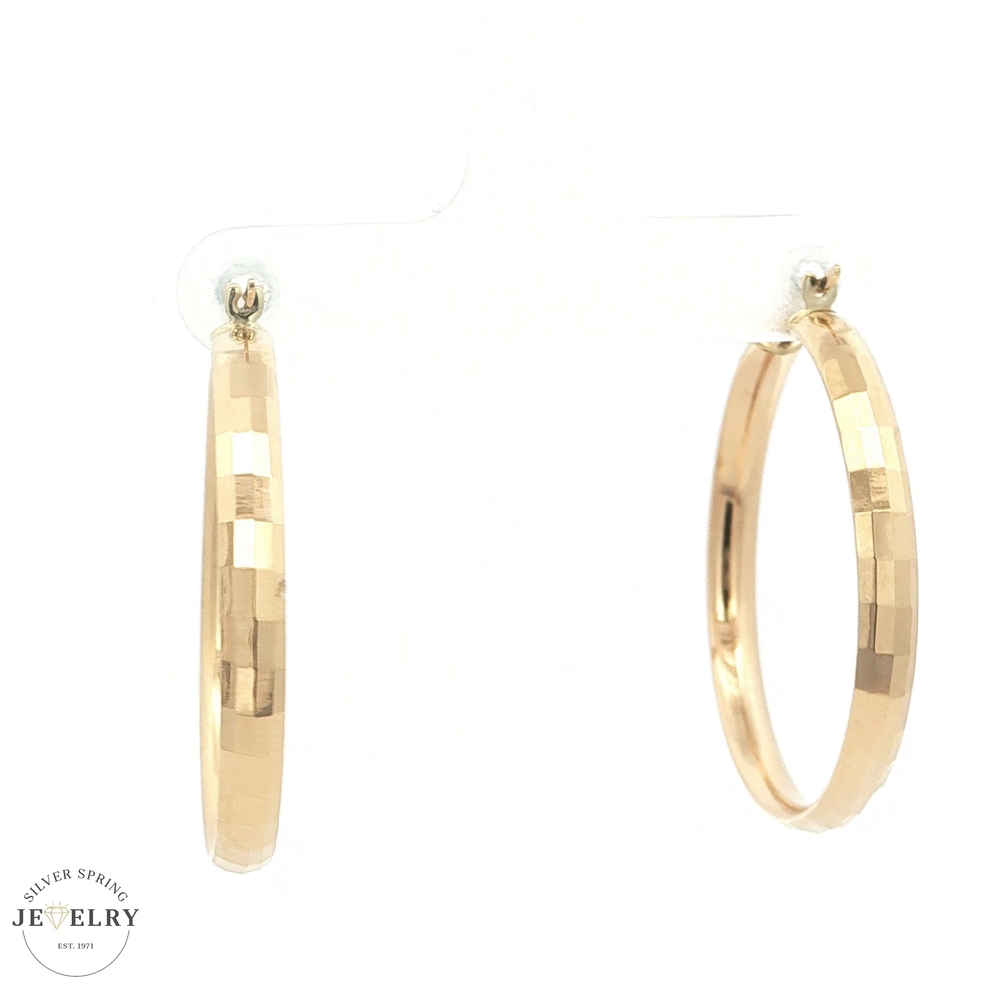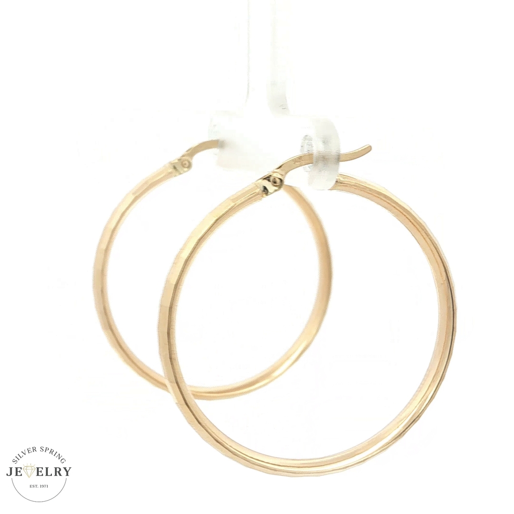Immerse yourself in sophistication with these yellow gold textured hoop earrings. Crafted in 14k gold, these 1 1/4in hoops are a classic and versatile choice for any woman's collection. Their textured design adds a sparkle, making them perfect for special occasions or casual wear. Weighing 4.7 grams, they're lightweight for comfortable wear. Upgrade your jewelry ensemble with these timeless gold hoop earrings.