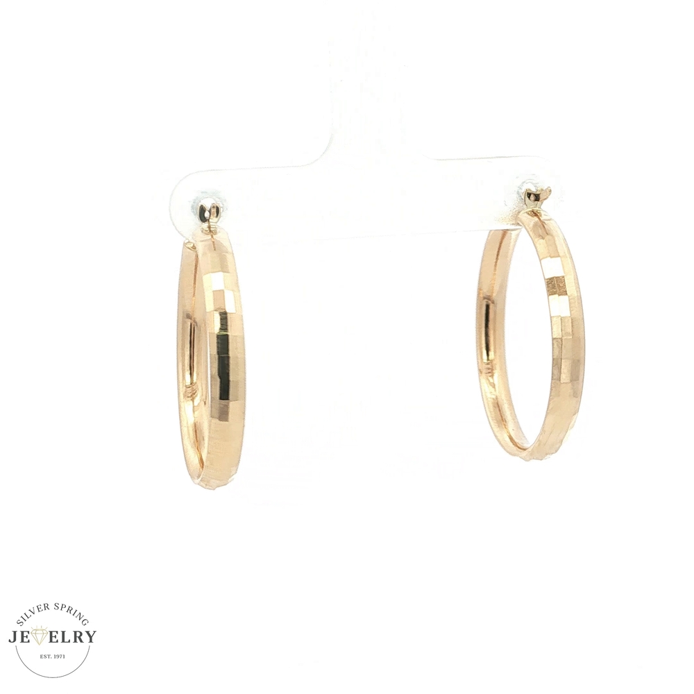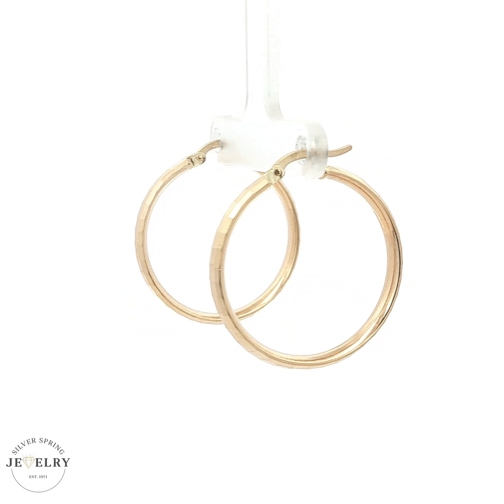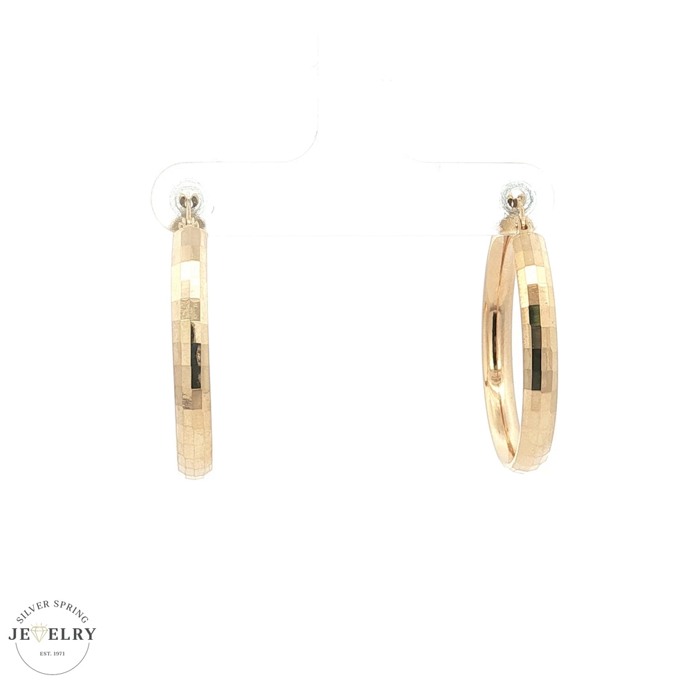 Enhance your accessory collection with these chic 14K Yellow Gold Textured Hoop Earrings. Exquisitely crafted, they weigh a comfortable 3.8 grams and offer a generous 1-inch diameter. These elegant accessories showcase a unique textured design that beautifully reflects light, adding a charming sparkle to any outfit. Suitable for everyday wear or special occasions, these timeless hoop earrings will effortlessly elevate your style. The perfect addition to any jewelry box, they make an impressive gift too.