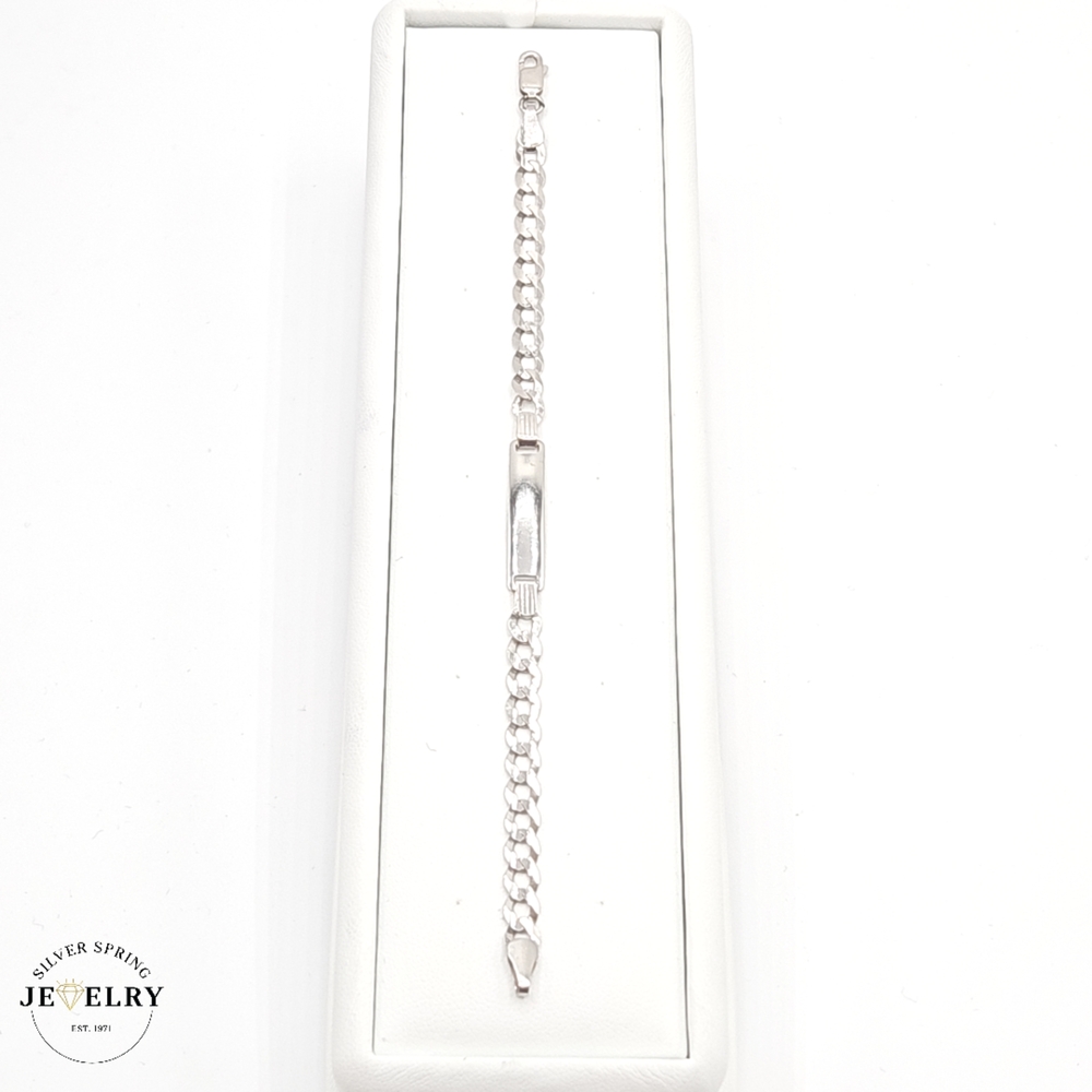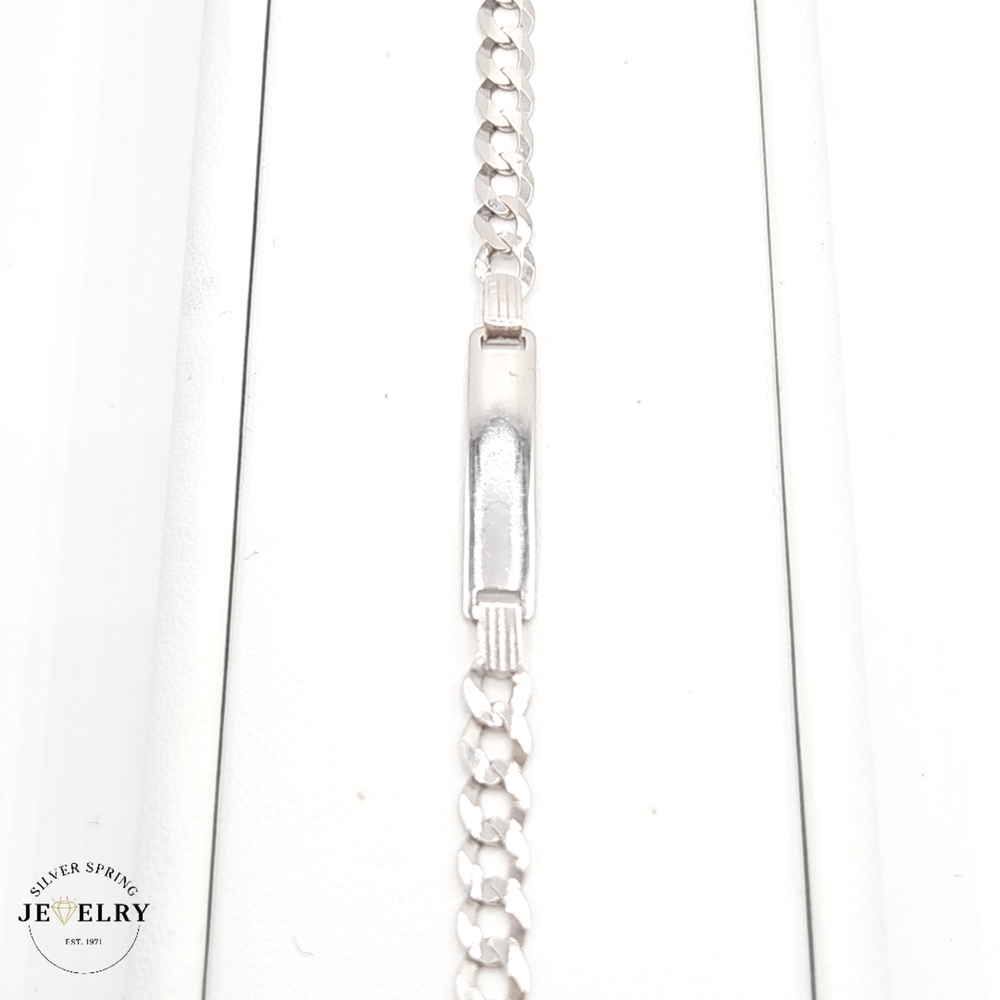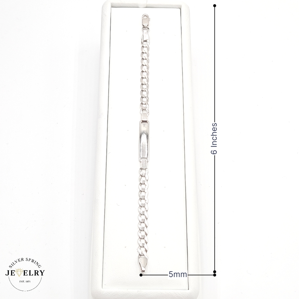 Presenting our exquisite Baby ID Curb Bracelet, beautifully crafted with 14kt white gold, weighing 4 grams. This bracelet features an elegantly diamond-cut texture and measures 5mm wide by 6 inches long, making it perfectly sized for petite wrists. A timeless piece of gift for baby's special occasions, this keepsake can be personalized with their name, creating a unique memento. An ideal combination of luxury, strength, and sophistication. Guaranteed to be loved by all.