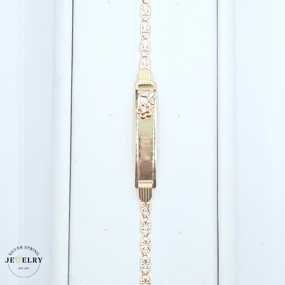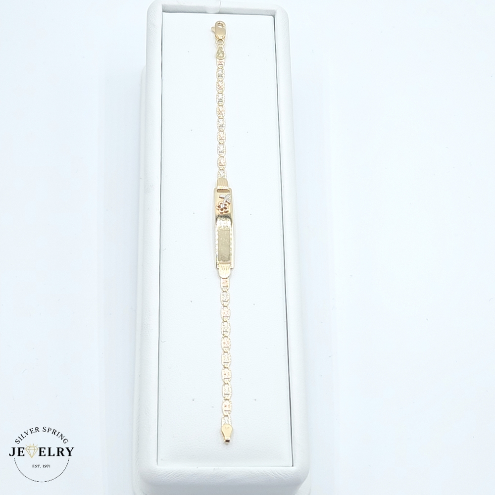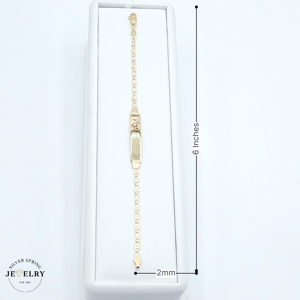 Presenting our Baby ID Valentino Bracelet, crafted expertly from 14kt gold, and weighing a substantial 3.50 grams. The bracelet features a delicate width of 3mm and a length of six inches, perfect for a baby's tiny wrist. Its highlight is an adorable floral detail that adds a touch of whimsy. This bracelet is not just a piece of jewelry but a keepsake to be cherished for years. A thoughtful choice for gifting or for celebrating your little one's special moments.