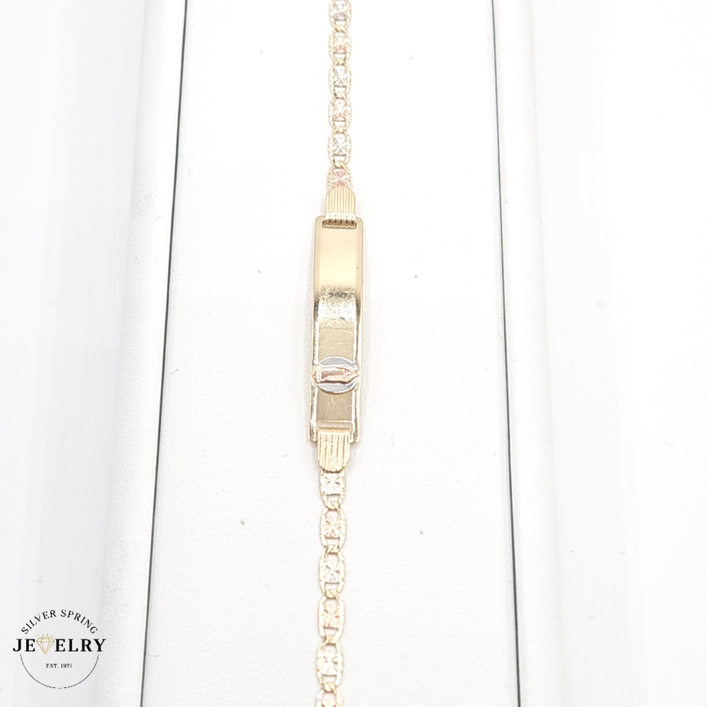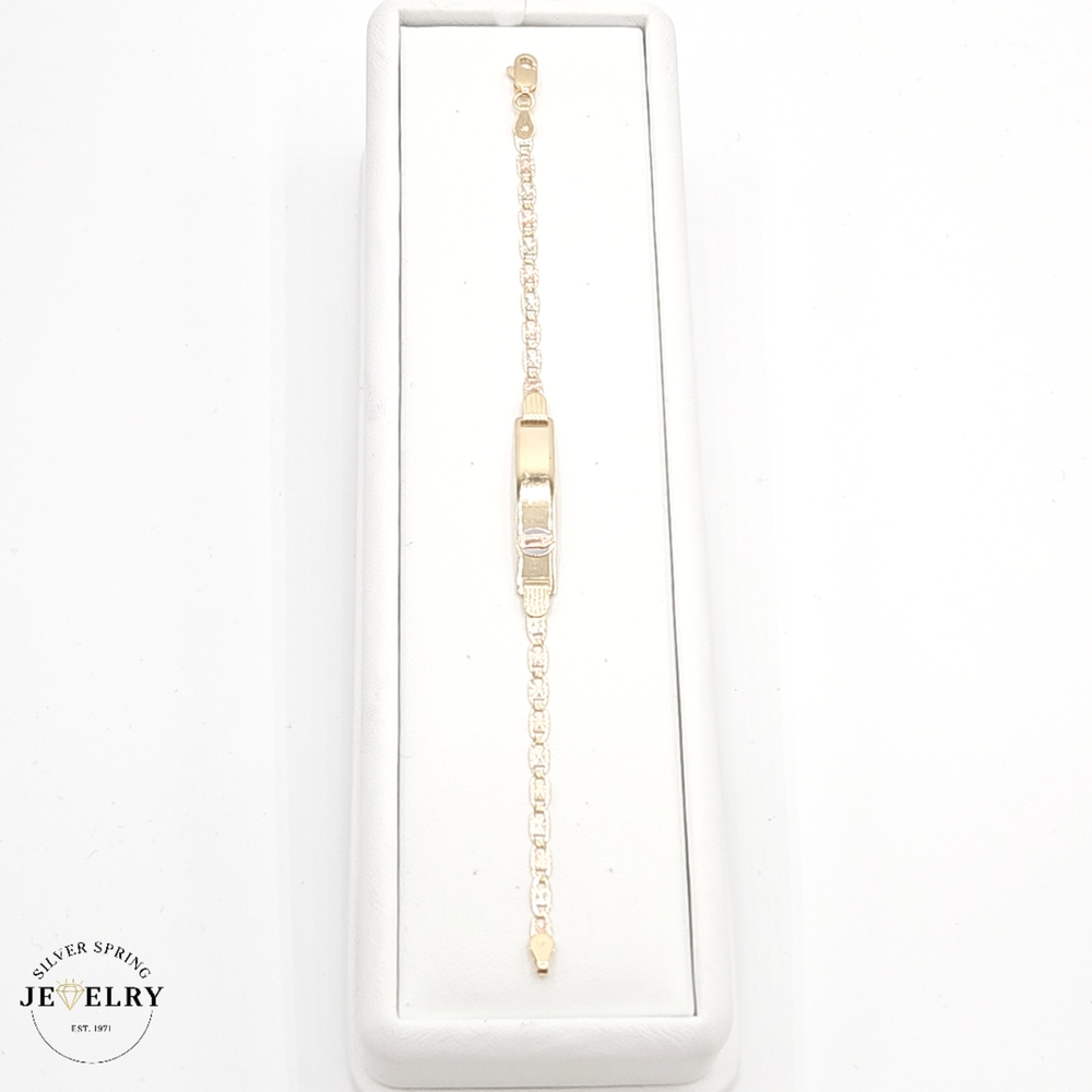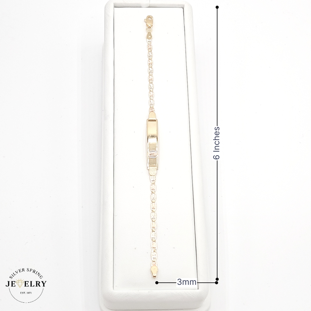 Showcase adorable elegance with this 14kt Baby ID Valentino Bracelet, weighing 3.60 grams. The piece has a 3mm width and 6 mm length, perfect for a baby's delicate wrist. Embedded in the design is a beautifully detailed depiction of the Lady of Guadaupe, adding a religious touch. An exquisite blend of beauty and virtue, this bracelet makes an ideal keepsake or gift.