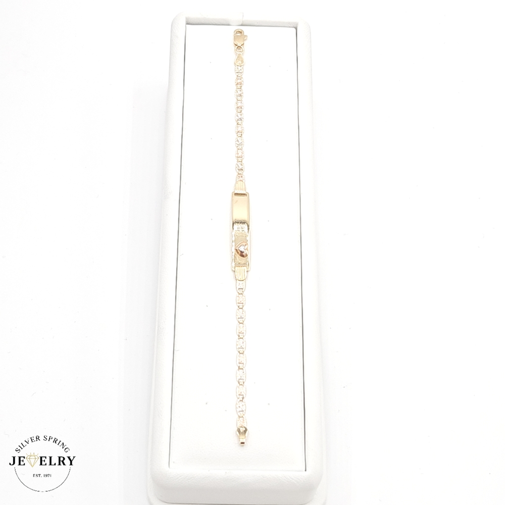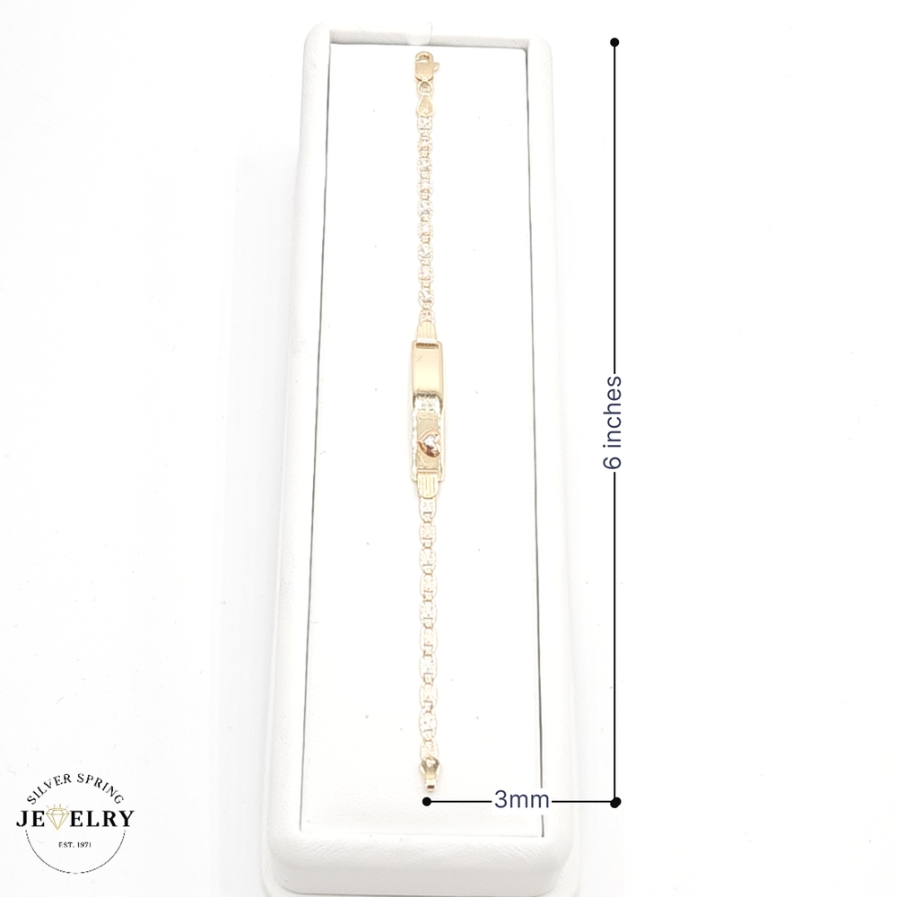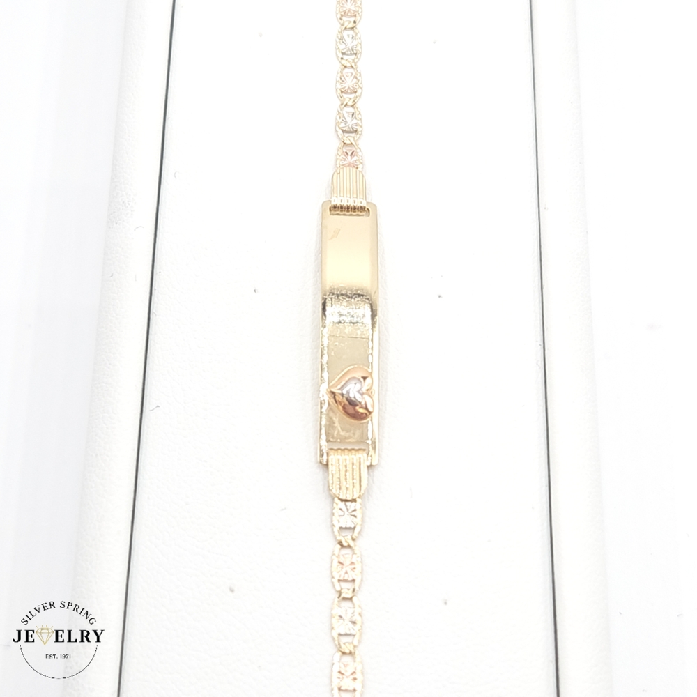Cherish your little one's precious moments with this stunning Baby ID Valentino Bracelet, elegantly crafted in 14kt gold. The bracelet weighs a modest 3.50 grams, making it lightweight and comfortable. Measuring 6 inches in length and 3mm in width, the piece is designed for a snug yet adequate fit. A charming heart-detailed plate adds a touch of sentimentality, making it a perfect keepsake. Customize it with a name or initial.