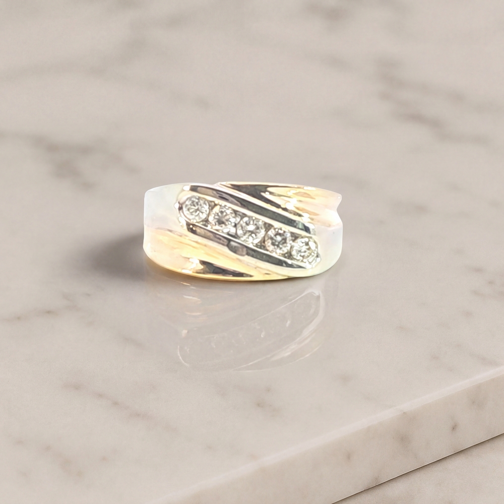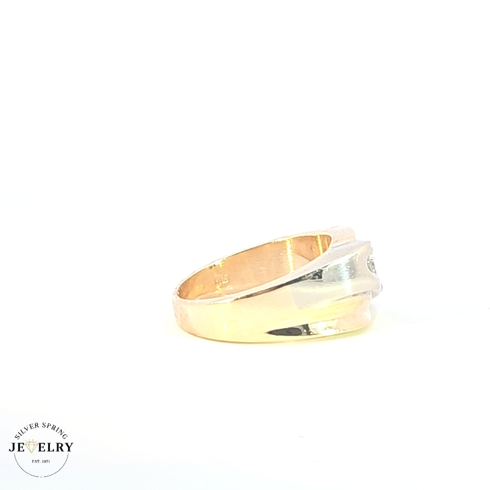 Introducing our men's band diamond ring, an elegant piece that exudes status and sophistication. Expertly fashioned from 14kt gold, the ring weighs in at a handsome 11.70 grams. It's adorned with approximately 0.75 ct of shimmering diamonds, adding a touch of opulence. With a size 10 fit, this piece is designed for a comfortable and secure wearing experience. Truly a symbol of luxury and magnificence, this ring is the perfect accessory for the stylish modern man.