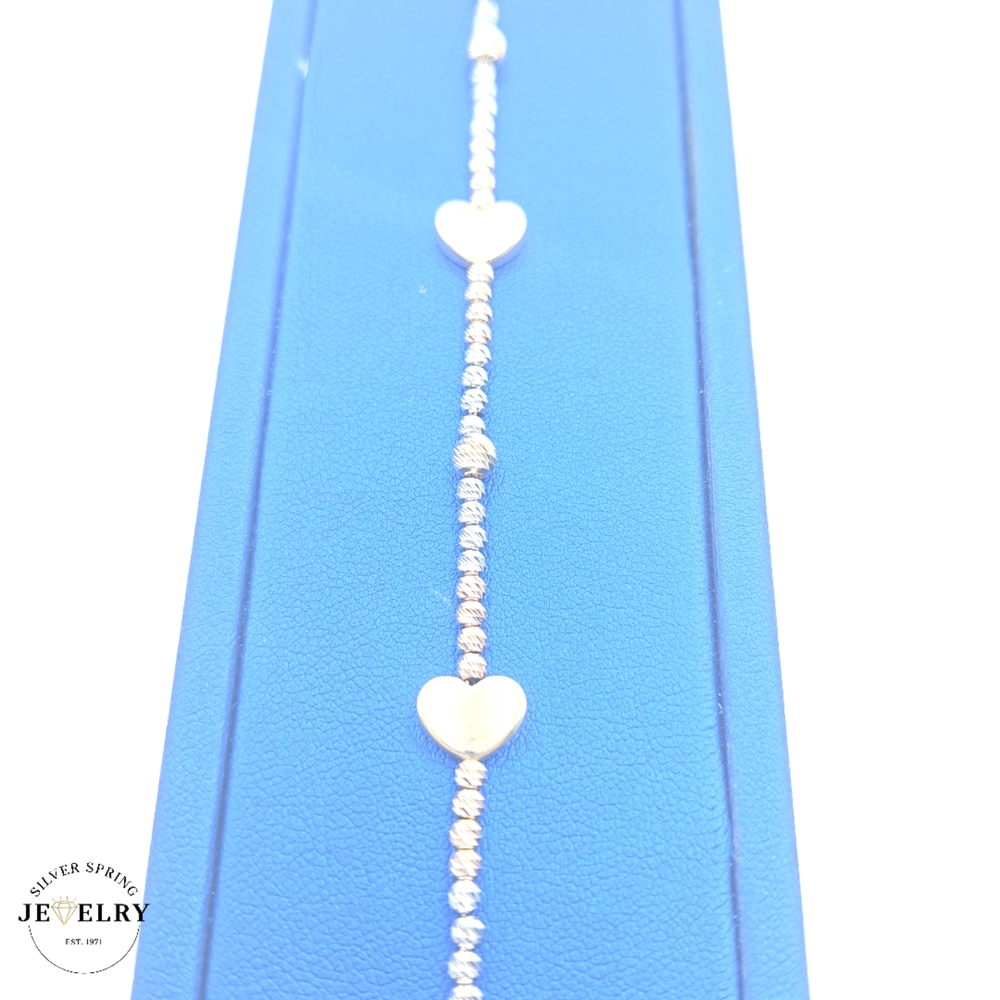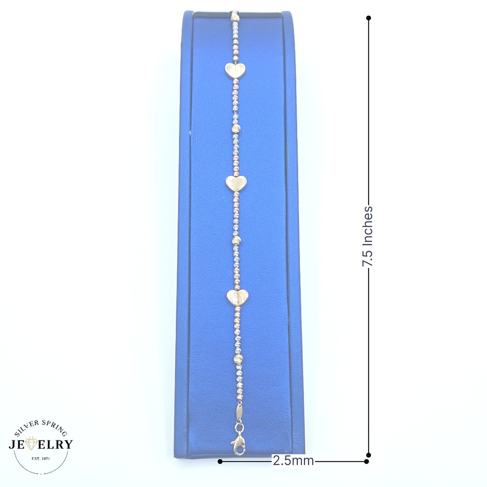 Accentuate your wrist with this beautiful Heart Beaded Bracelet, delicately crafted from 14K Tricolor Gold. It weighs 4.7 grams, adding a substantial but comfortable feel. The bracelet features an appealing diamond-cut finish, adding sparkle and shine. Measuring 2.5mm wide and 7.5 inches long, it fits comfortably around your wrist. With its heart-shaped bead design, this bracelet adds a touch of elegance and charm to any outfit. Perfect for any occasion or as a thoughtful gift.