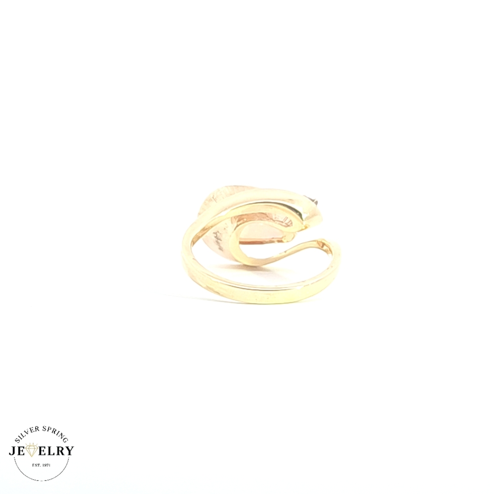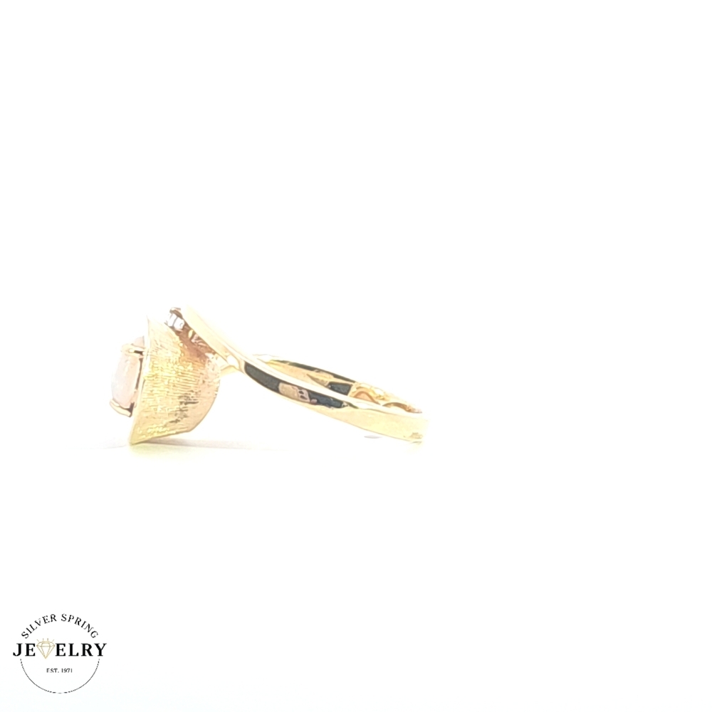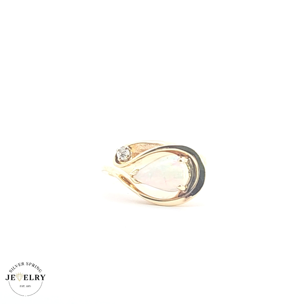 This elegant Opal Ring weighs 3.9 grams and comes in a size 5. Skillfully crafted in 14kt gold, it is delicately adorned with a luminous opal stone encircled by sparkling zirconia accents, adding a touch of shimmer. The ring's exquisite design and opal's mesmerizing colors ooze sophistication. It is a fine piece of jewelry that beautifully aligns with any attire, be it casual or formal. An ideal accessory that adds charm and elegance to your look.