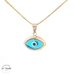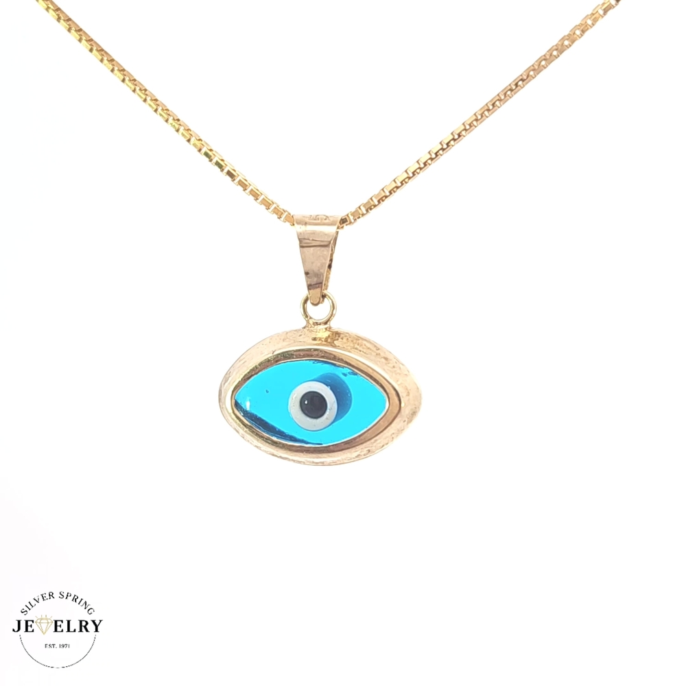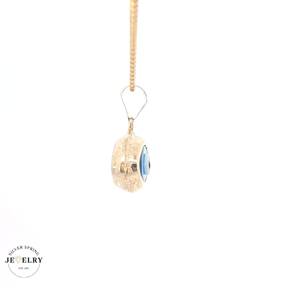 Presenting a Blue Evil Eye pendant, meticulously crafted from 14kt gold, weighing 1.1 grams. This dainty piece measures 14mm in width and 0.50 inches in length, making it a subtle yet exquisite addition to any jewelry collection. Known for their protection against misfortune, Evil Eye accessories are more than just ornamental pieces. They carry an aura of positivity, making this pendant a meaningful accessory to own or an excellent gift option.