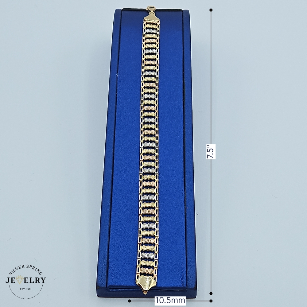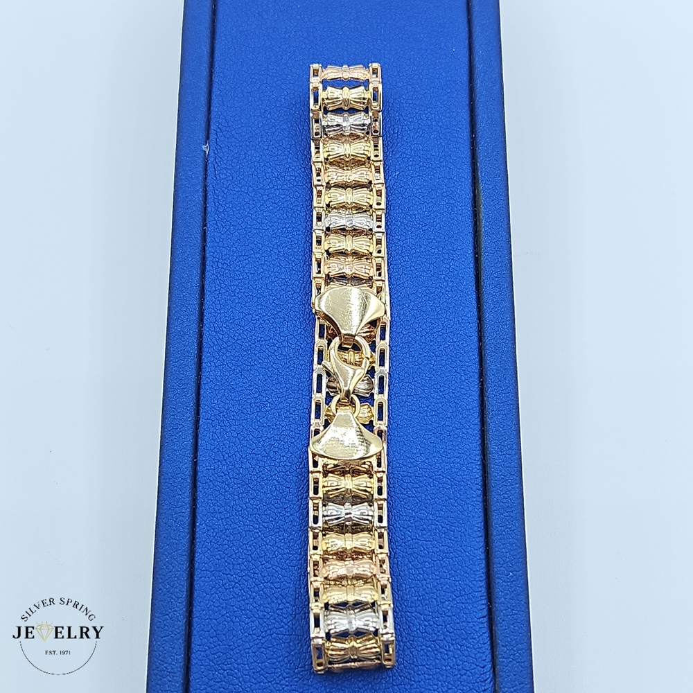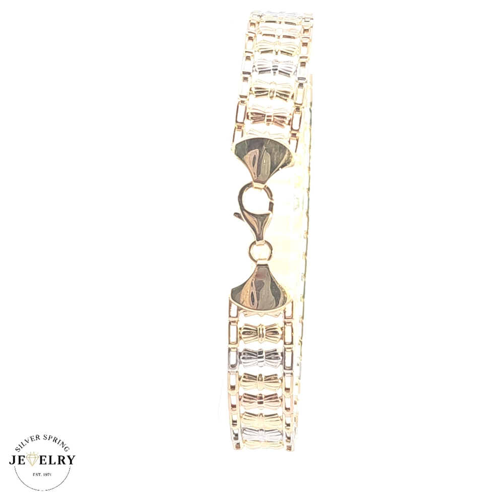 Showcase your stylish persona with this stunning 14kt Tricolor Bow Tie. Weighing 7.4 grams, this striking piece is crafted with precision and elegance in mind. Measuring 10.5 inches in width and 7.5 inches in length, it makes a statement that is hard to ignore. The unique blend of three colors brings a touch of sophistication to any outfit. Stand out from the crowd with this exceptional piece.