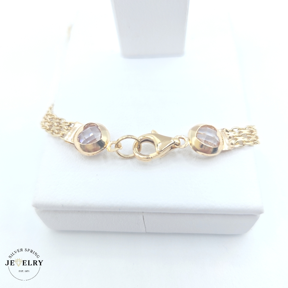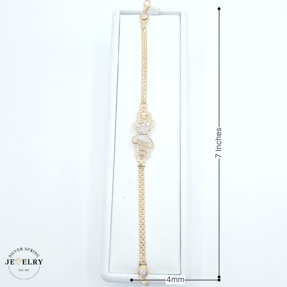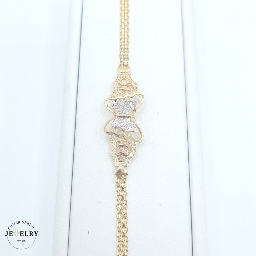 The Butterfly Birsmark Bracelet is a stunning piece crafted in 14K gold and weighs 6.3 grams. This sophisticated accessory features a 4mm width and a standard length of 7 inches, perfect for most wrist sizes. Encrusted with zirconia stones for that extra sparkle, this bracelet makes for an ideal addition to any collection. It's a versatile piece that adds the right amount of elegance and sophistication, making it suitable for both casual and formal wear. A true embodiment of luxury and style.