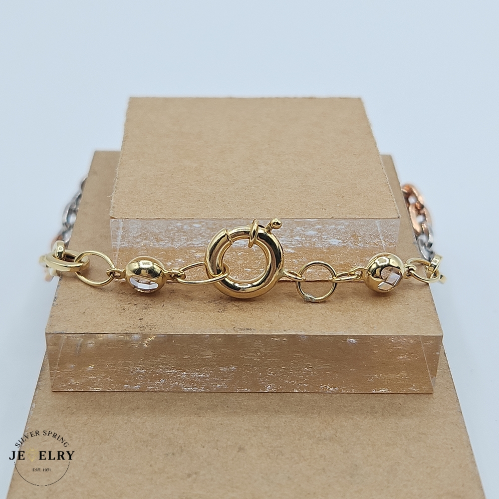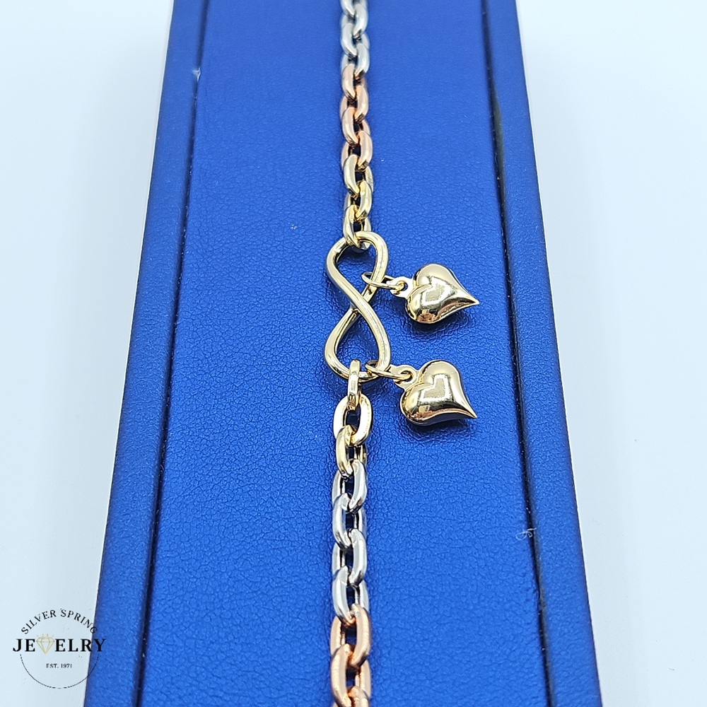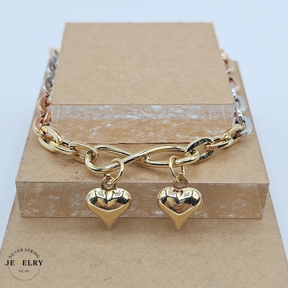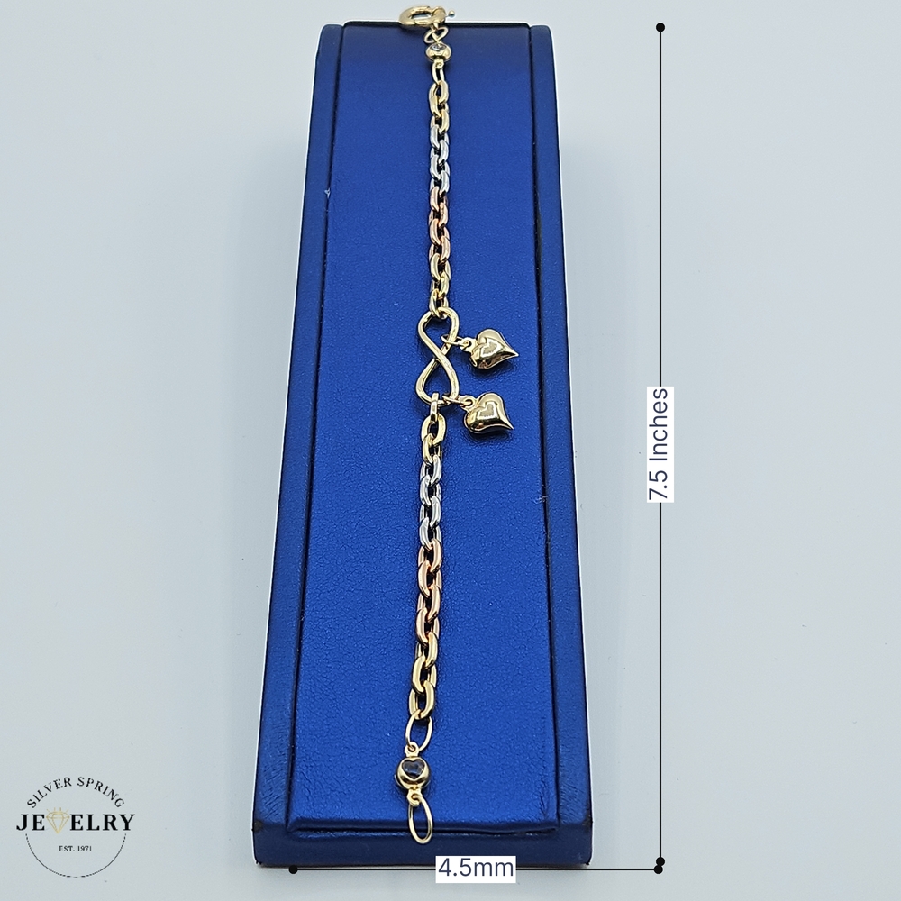 Introducing a gorgeous tricolor cable link bracelet, made from high-quality 14K gold and weighing 5.6 grams. Its dimension includes a width of 4.5mm and a length of 7.5 inches, ensuring a comfortable fit around your wrist. The center features a delicately crafted heart intertwined with an infinity symbol, symbolizing everlasting love. This uniquely designed piece beautifully melds timeless elegance with contemporary style. Perfect for a gift or as a special treat for yourself.