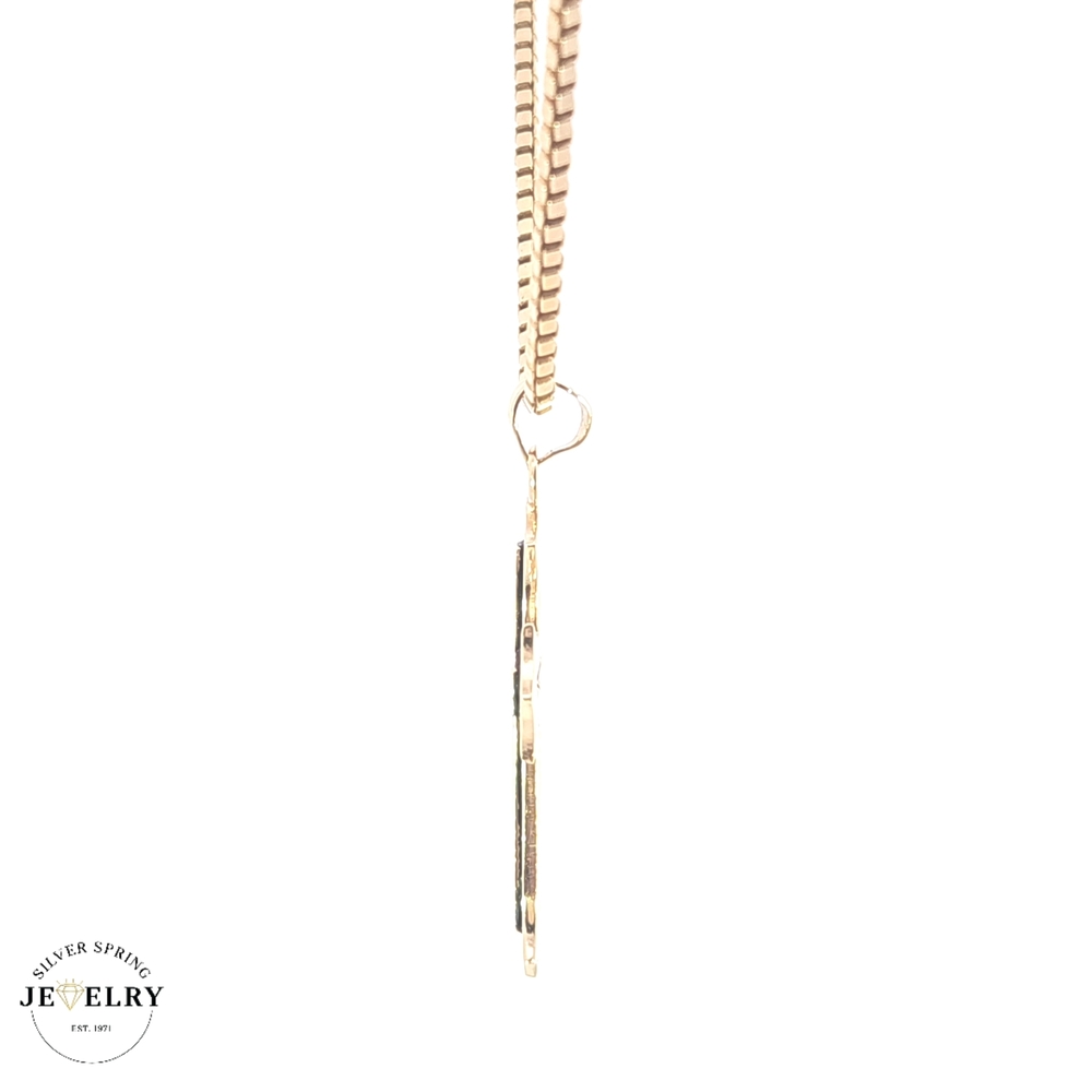 This 14kt gold gothic style cross exhibits profound craftsmanship. Weighing 4.00 grams with a width of 5mm and a length of 1.25, its modest size does not compromise its striking presence. The Gothic influence gives it an archaic allure, making it a statement piece of jewelry. Its rich historical styling, coupled with the charm of gold, makes it a well-crafted piece to add to your collection. CHAIN IS NOT INCLUDED