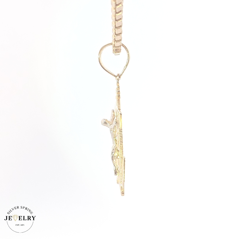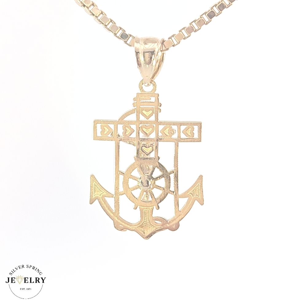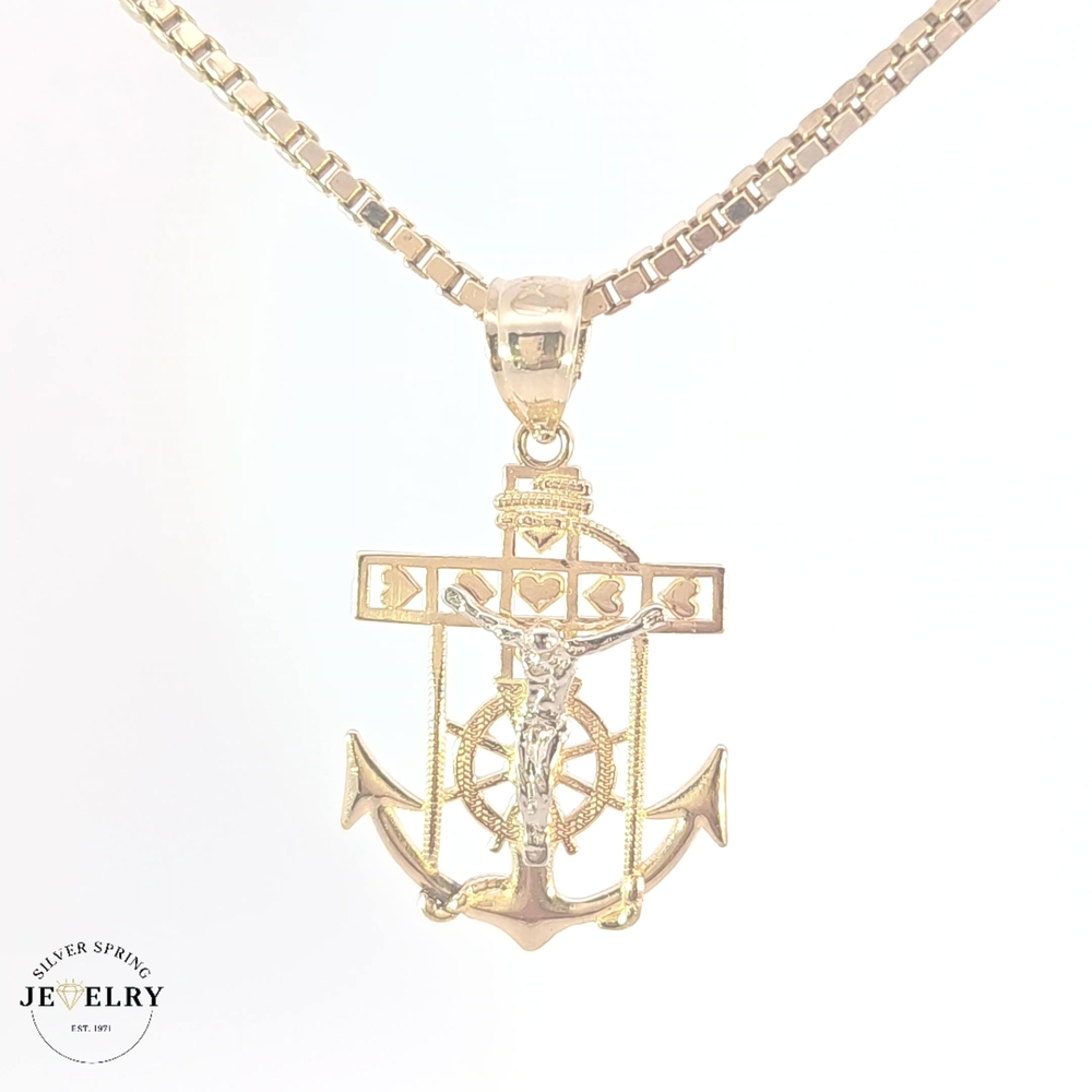 This superior quality Crucifix Anchor Pendant is uniquely crafted in 14kt two-tone gold. Weighing 1.90 grams, it presents a combination of elegance and durability. The pendant measures 18mm in width - offering a prominent yet comfortable size for regular wear. It features the iconic symbol of the cross and anchor intertwined, epitomizing safety and faith. The two-tone design offers a subtly dynamic effect, bringing an extra layer of visual interest. This pendant is an excellent choice for those wanting to express their faith with a stylish piece of jewelry.