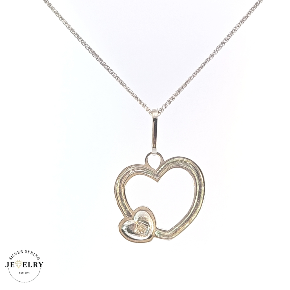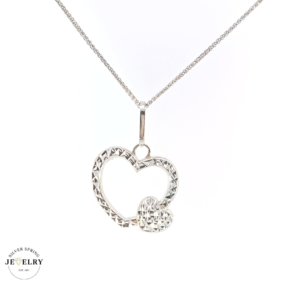 Behold this beautiful Double Heart Diamond Cut pendant, meticulously crafted from 14kt gold and weighing 2.3 grams. It showcases a superb diamond cut, providing extraordinary sparkle at every turn. The pendant measures 20mm in width, ideal for those who prefer standout jewelry. Its total length is approximately 1 inch, hanging perfectly on any necklace length. This heart-to-heart design radiates love and affection, making it the perfect gift or a special addition to your jewelry collection.