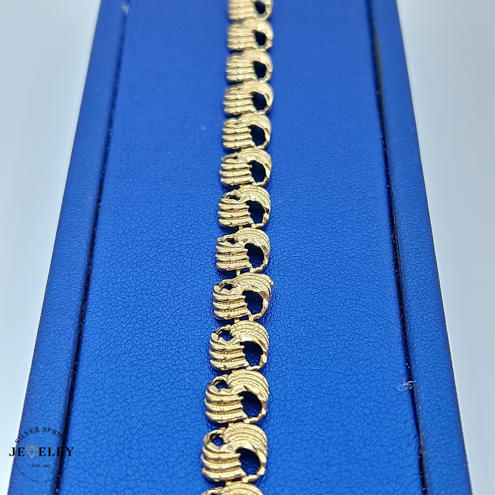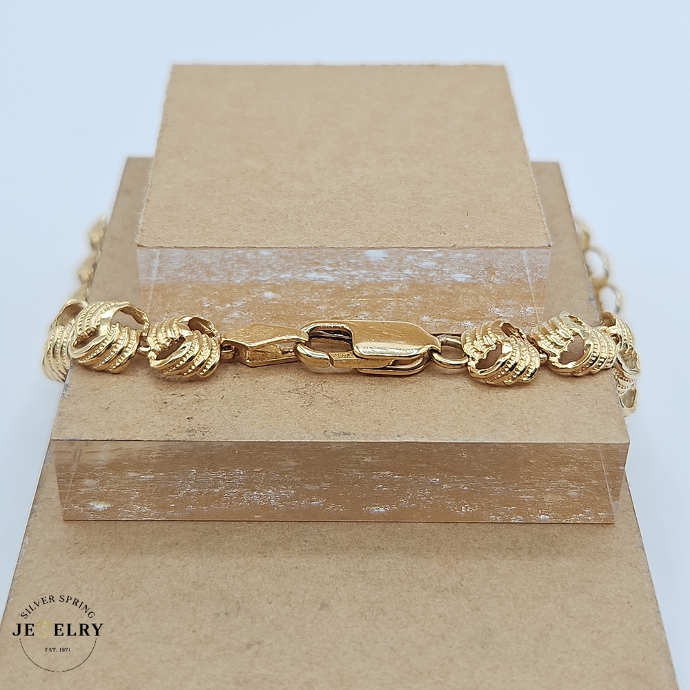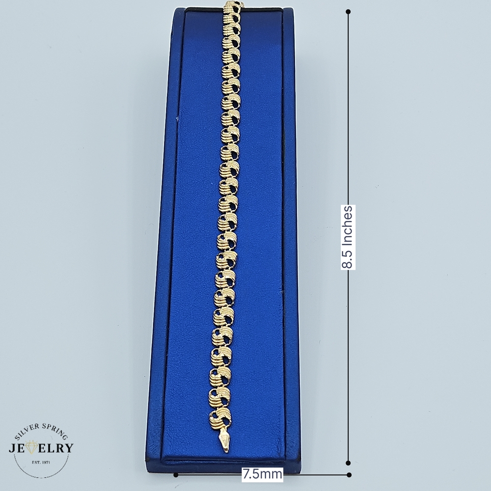 Experience the elegance of this Fancy Link Bracelet, expertly crafted from 14 karat gold and weighing a substantial 11.6 grams. This bracelet presents a dazzling diamond-cut design, adding a touch of brilliance and depth to its appearance. It measures 8 inches in length and 7.5mm in width - a perfect fit for both style and comfort. This exquisite piece effortlessly blends durability with luxurious charm, making it perfect for everyday wear or special occasions.