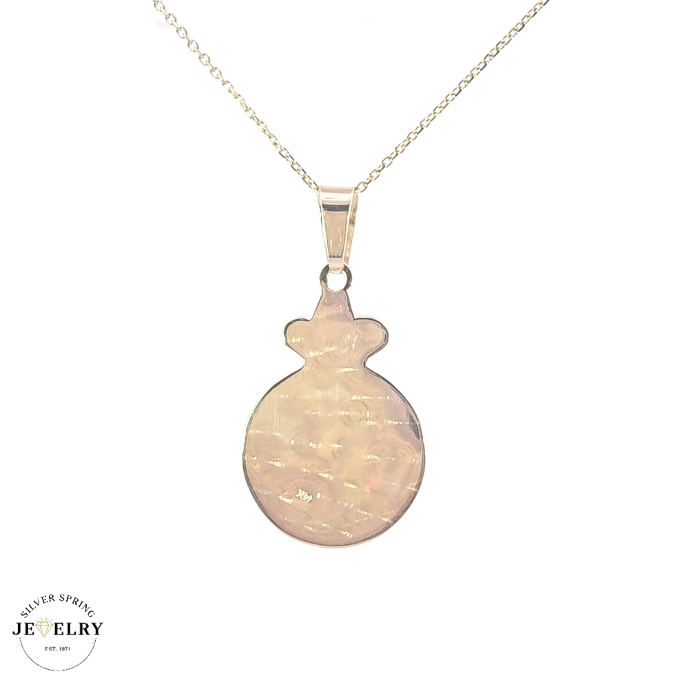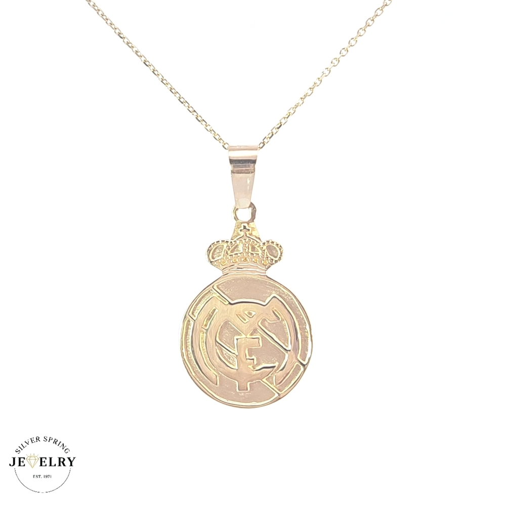 Show off your football spirit with this Real Madrid Pendant made with 14-karat gold. The pendant, signifying one of the world's most iconic football clubs, weighs 5.6 grams. With its width of 22mm and length of 1 1/2 inches, it serves as a fine piece of jewelry, highlighting your love for the game and team. It's a stunning and sophisticated way to represent your allegiance to Real Madrid.