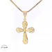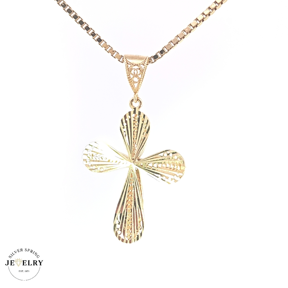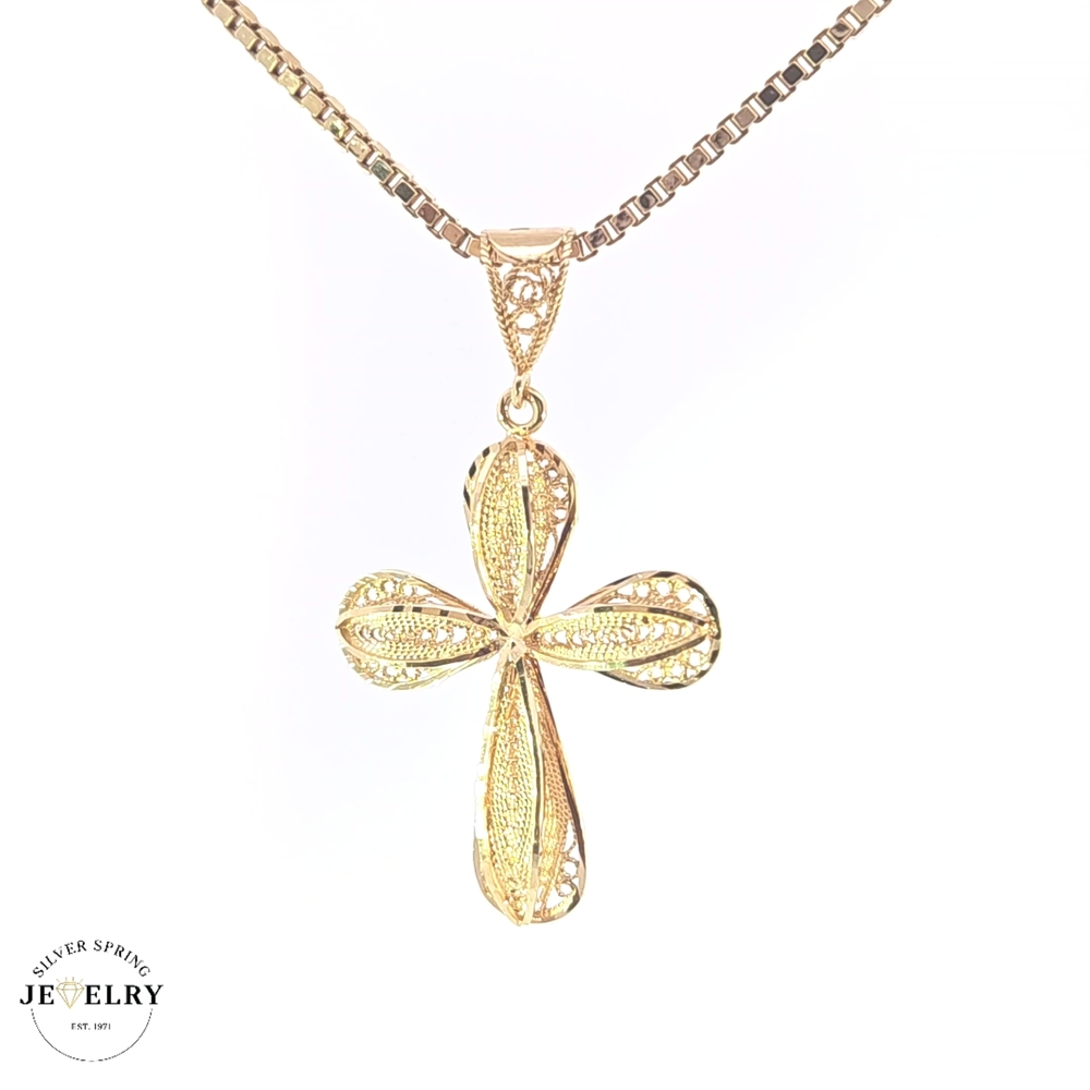 This stunning Filigree Cross is crafted in 14kt gold, providing a timeless and elegant appeal. It weighs a solid 3.0 grams, exhibiting its fine, high-quality craftsmanship. With a width of 7mm, it presents a delicate yet substantial presence. Its length, measuring at 1.25, ensures it’s noticeable without being overbearing. This intricately designed filigree religious piece is an ideal accessory for faith-inspired style or as a meaningful gift to your loved ones.