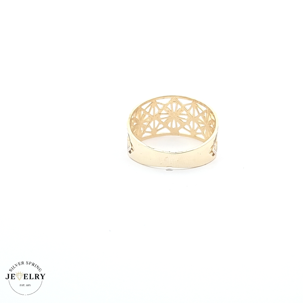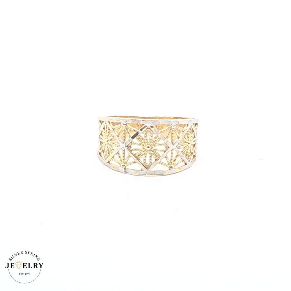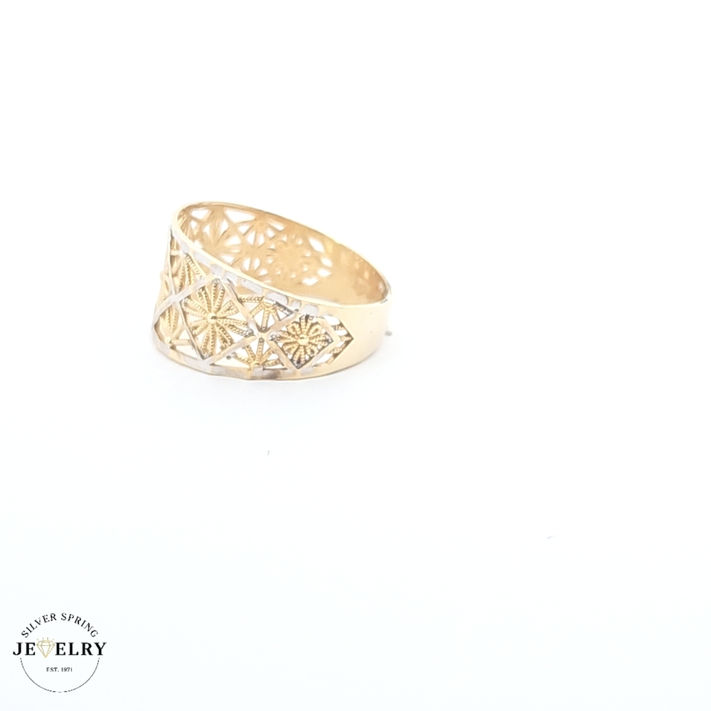 This exquisite filigree ring is made of 14kt gold and weighs 2.70 grams. It boasts a delicate design, which showcases intricate craftsmanship. The ring's timeless elegance can add a touch of sophistication to any outfit. Available in size 7, this ring offers a comfortable fit for everyday wear. This filigree ring makes a valuable and stylish addition to any jewelry collection or a heartfelt gift for a loved one.