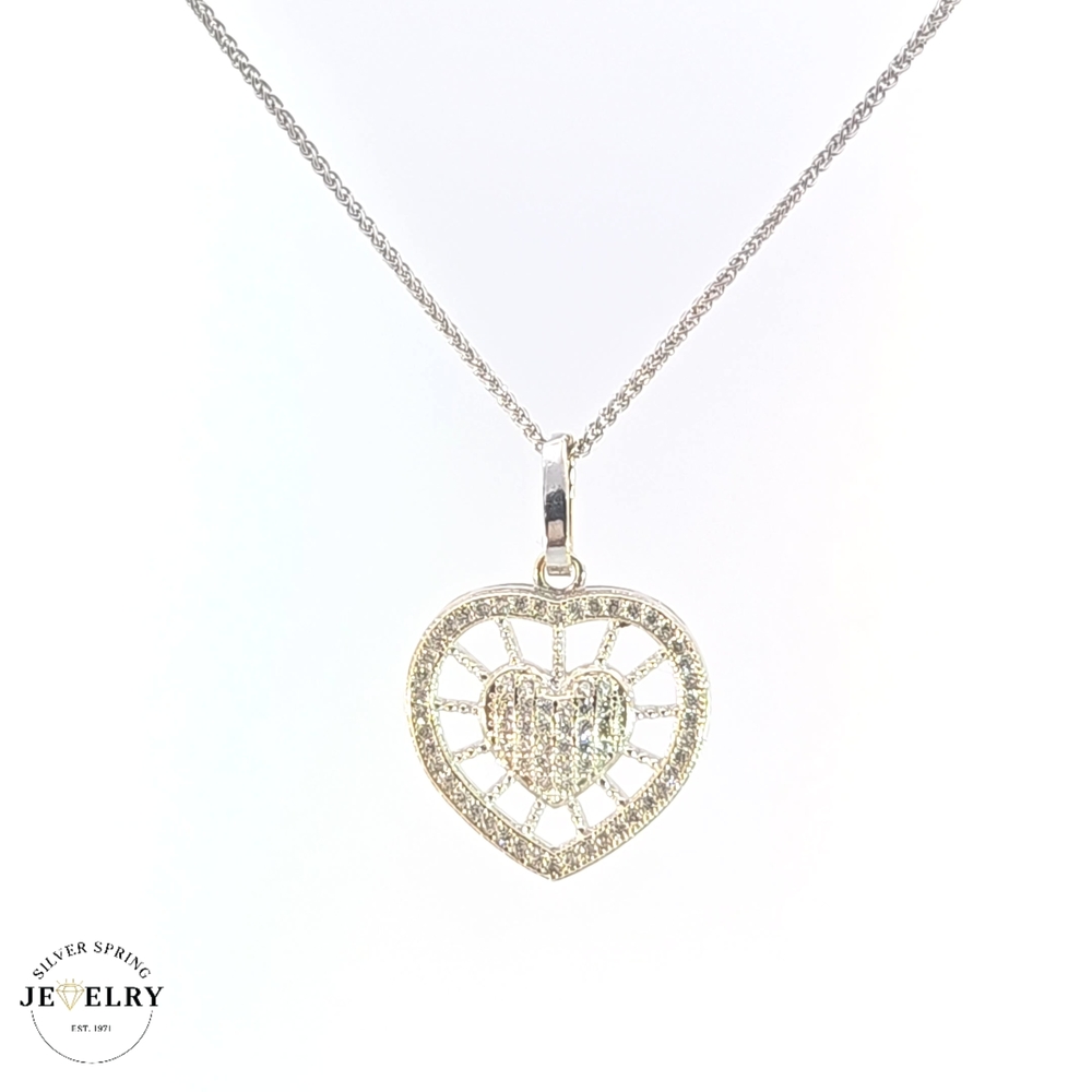 Discover our Heart Pendant, delicately crafted in 14K gold and weighing 2.7 grams for a comfortable feel. The pendant measures 18mm in width and extends to a length of 1 inch, creating a balanced and noticeable presence. It features beautiful zirconia crystals, adding an extra element of sparkle and elegance to any outfit. This heart-shaped pendant makes an ideal gift for any jewellery lover. It's not just a piece, it's a statement.