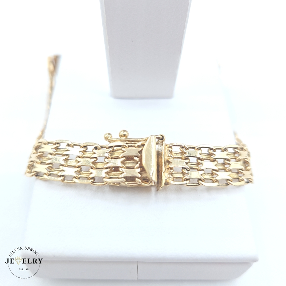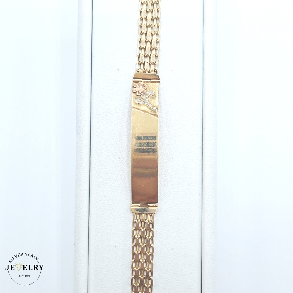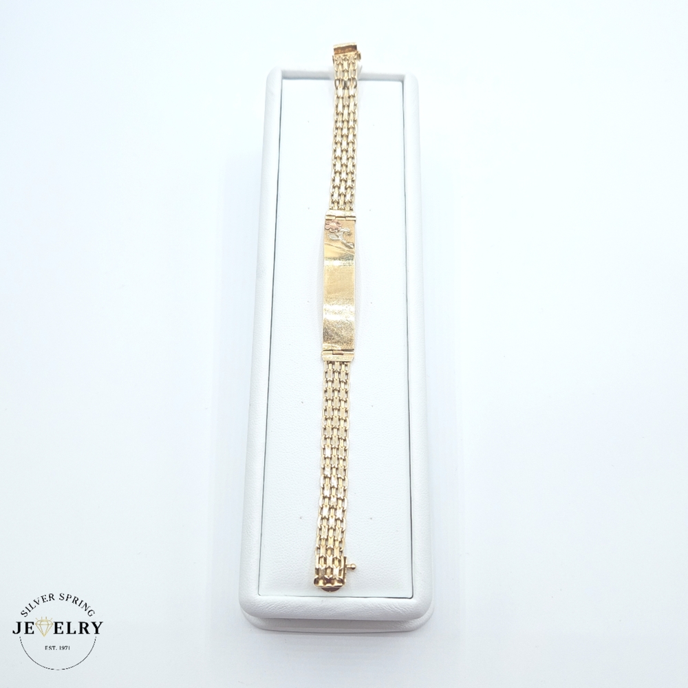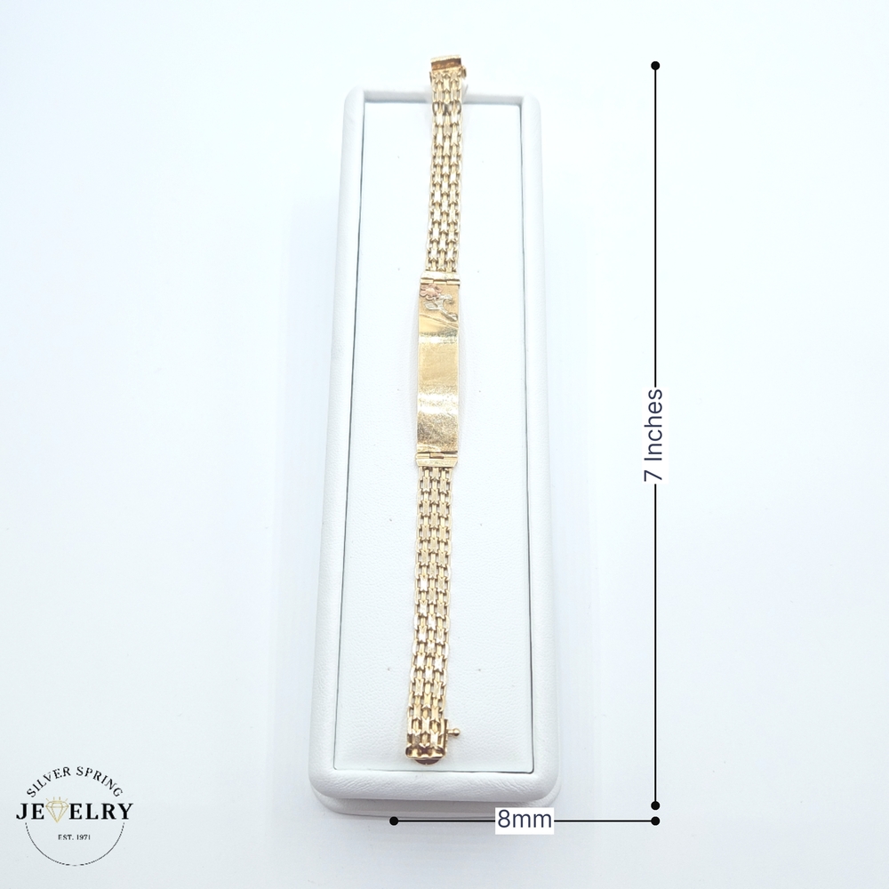 The Quinceañera Bismark Link Bracelet is a stunning piece of jewelry made of 14kt gold. Weighing just 2.3 grams, this demure yet classy piece exhibits excellent craftsmanship. The bracelet has a width of 8mm and a length of 7 inches, making it a comfortable fit for most wrist sizes. Its id tag recognizes the tradition of a Quinceañera, making it a thoughtful gift for a young lady reaching this milestone.