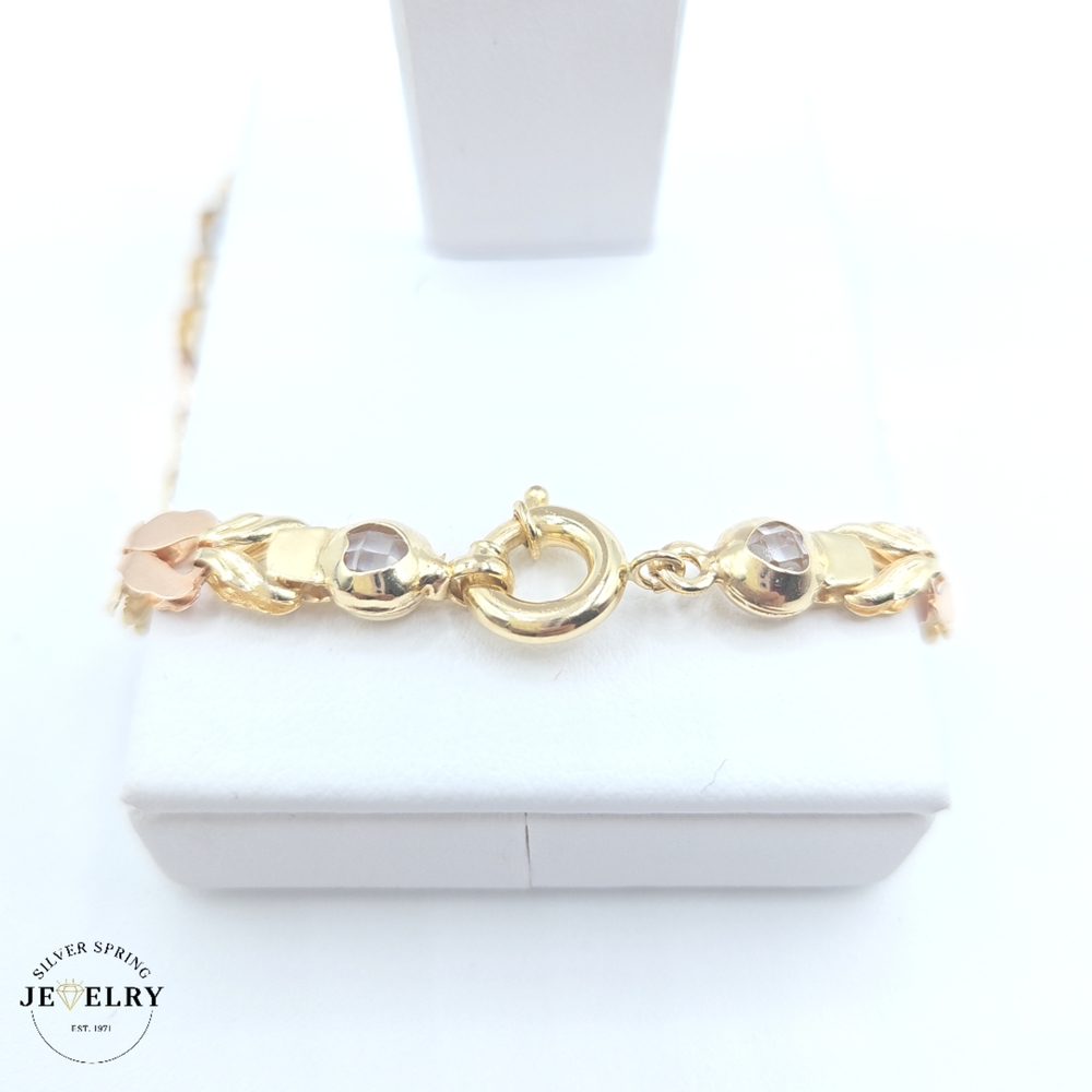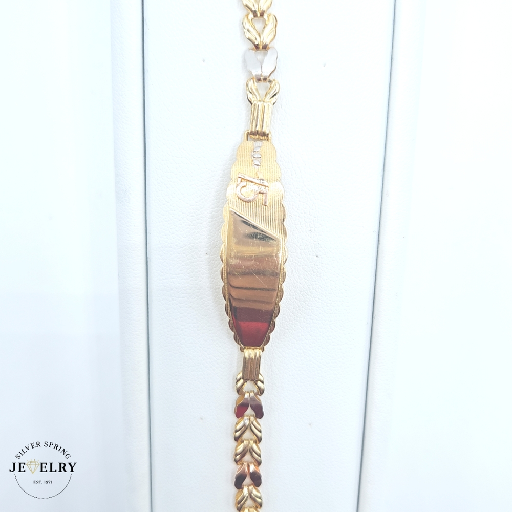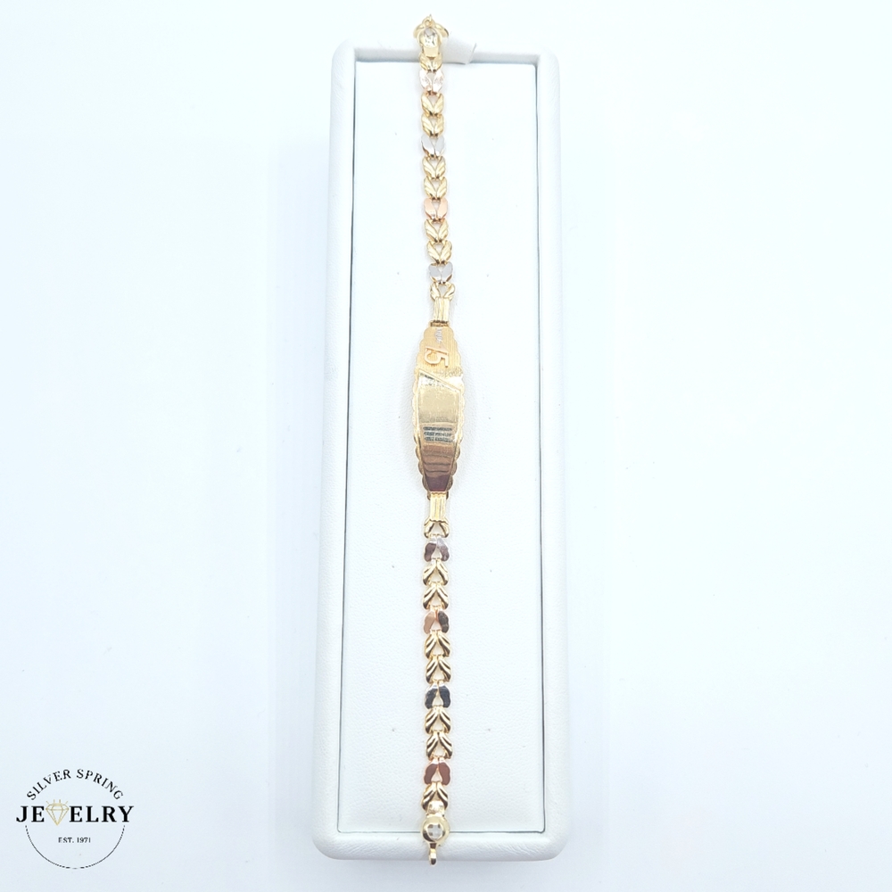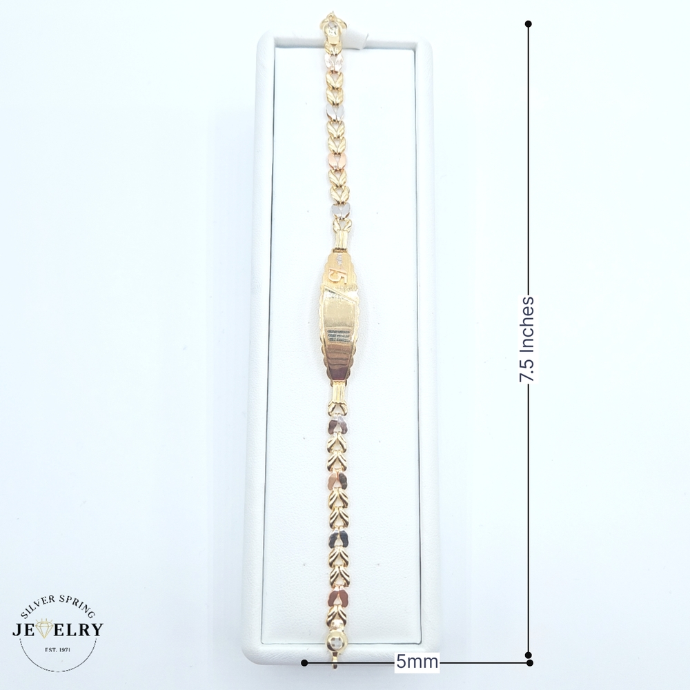 Introducing the ID Quinceañera Leaf Link Bracelet, a majestic piece made from 14kt tri-colored gold. It weighs 7.1grams and spans a length of 7.5 inches, ideal for most wrist sizes. The bracelet's width is 5mm, offering a perfect balance of delicacy and visibility. Featuring a leaf-link design, this piece showcases luxury and elegance. This Quinceañera bracelet is a timeless keepsake to commemorate a girl's transition into womanhood. Delicate and refined, it's an ideal gift or perfect adornment for special occasions.
