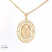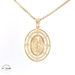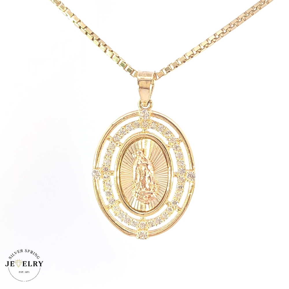 Featuring a stunning Lady of Guadalupe design, this two-tone pendant is crafted from luxurious 14kt gold, weighing approximately 3.80 grams. With dimensions of 18mm width and 1 inch length, the pendant showcases ornate detailing. It's adorned with sparkling zirconia for an added touch of elegance, offering a beautiful symbol of faith and devotion. A versatile piece, its two-tone design ensures it complements various attire effortlessly.