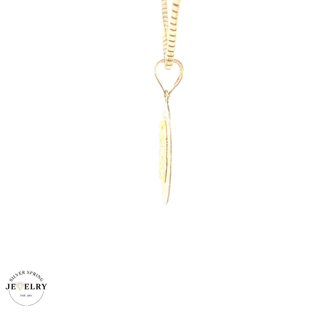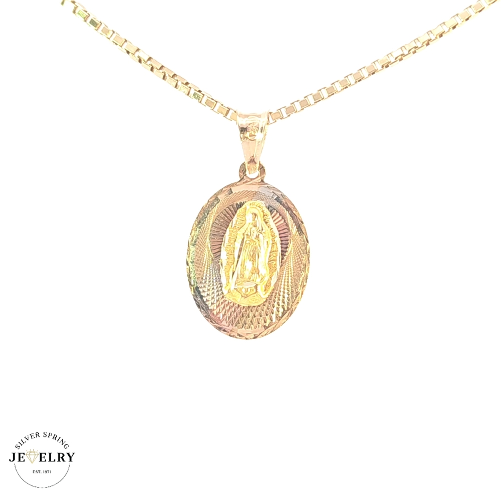 This beautiful Lady of Guadalupe pendant, crafted from 14KT tricolor gold, presents a gorgeous diamond-cut finish. With a weight of 1 gram, it is lightweight yet robust. The pendant has a width of 13mm and a length of 0.75 inches, contributing to its elegant size. Imbued with cultural significance, this exquisite piece of jewelry serves as a thoughtful representation of faith and devotion. Its tricolor gold and precise craftsmanship lend it a unique charm and timeless aesthetic.