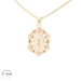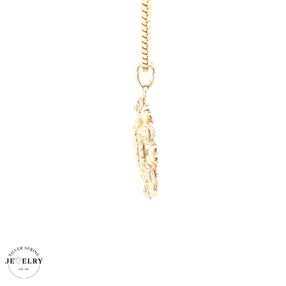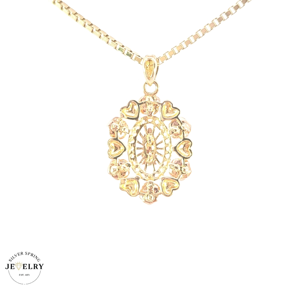Experience the deep spirituality and vibrant craftsmanship of this Lady of Guadalupe pendant, crafted from premium 14kt gold and weighing 1.80 grams. The pendant has a width of 13mm and a length of 0.75 inches, providing a conspicuous yet comfortable presence. Its design intricately features roses around the border, symbolizing purity and love, which accentuates the religious iconography. The addition of sparkling zirconia stones gives the piece a touch of sophisticated glamour. This pendant is a perfect keepsake or gift for those who cherish faith and fashion.