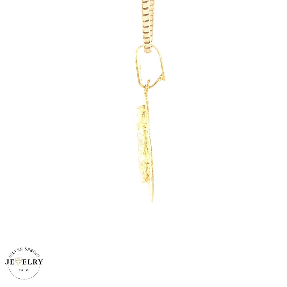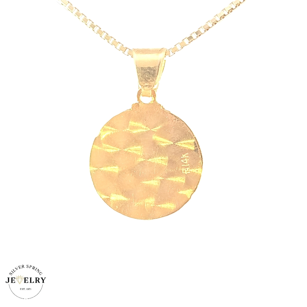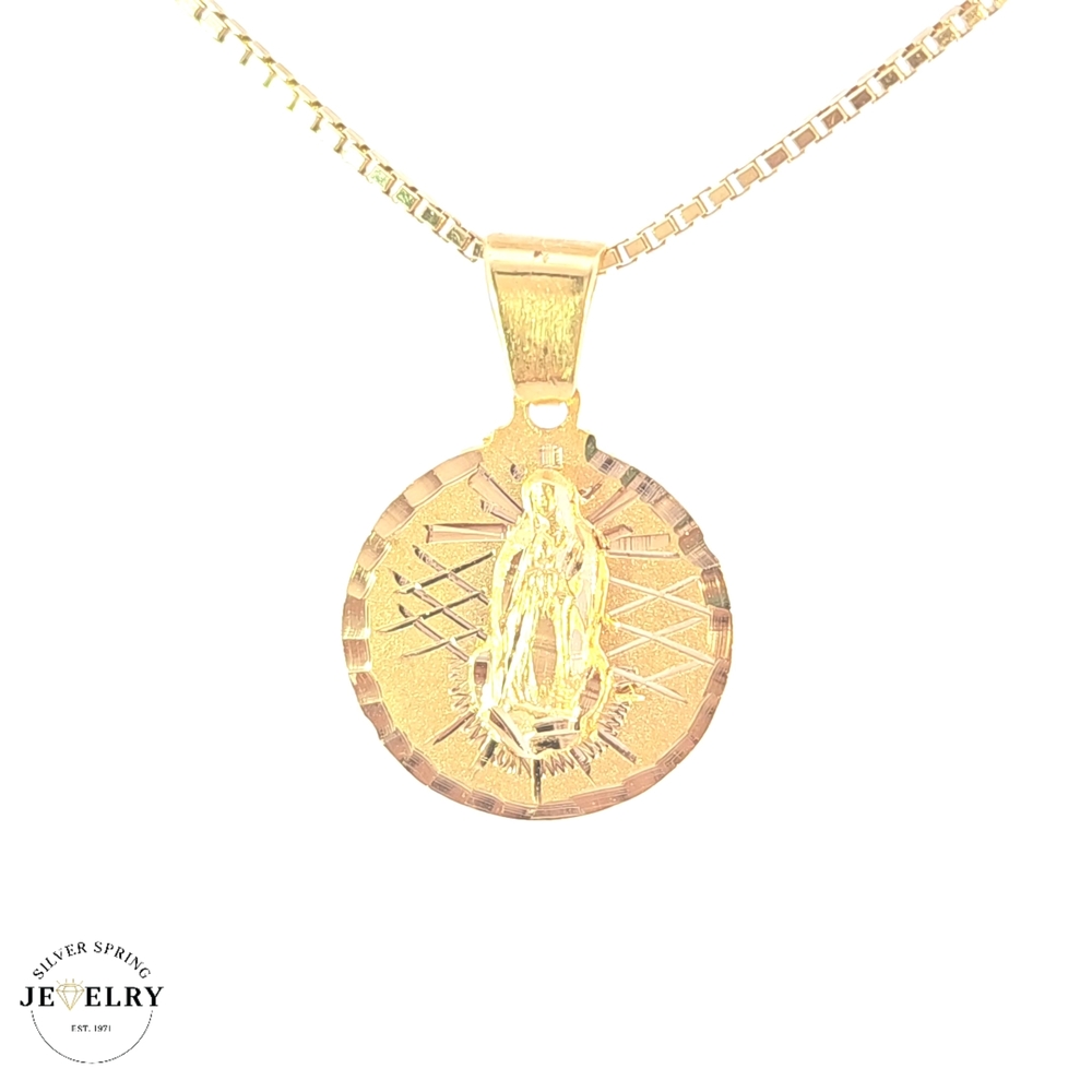 Experience spiritual style with this 14kt Lady of Guadalupe pendant. Weighing 2.30 grams with a diameter of 18mm, this piece showcases a delicate design with its diamond-cut detailing. Crafted in high-quality gold, it embodies elegance, religious devotion, and craftsmanship. This limited edition pendant makes for a unique and meaningful accessory or gift. Wrap yourself in faith-inspired luxury with our Lady of Guadalupe pendant.