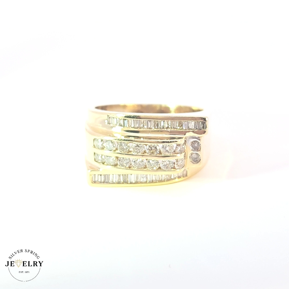 This elegant men's ring embodies masculine sophistication. Crafted from premium 14kt gold, it's a substantial piece weighing 12.20 grams. The ring is 5mm wide, providing a comfortable fit. It's embellished with 1 1/4CT diamonds, which add a striking touch of radiance and luxury. The ring size is 11, which is a popular standard for men. This exquisite piece combines style, durability, and charm, making it a perfect choice for daily wear or special occasions