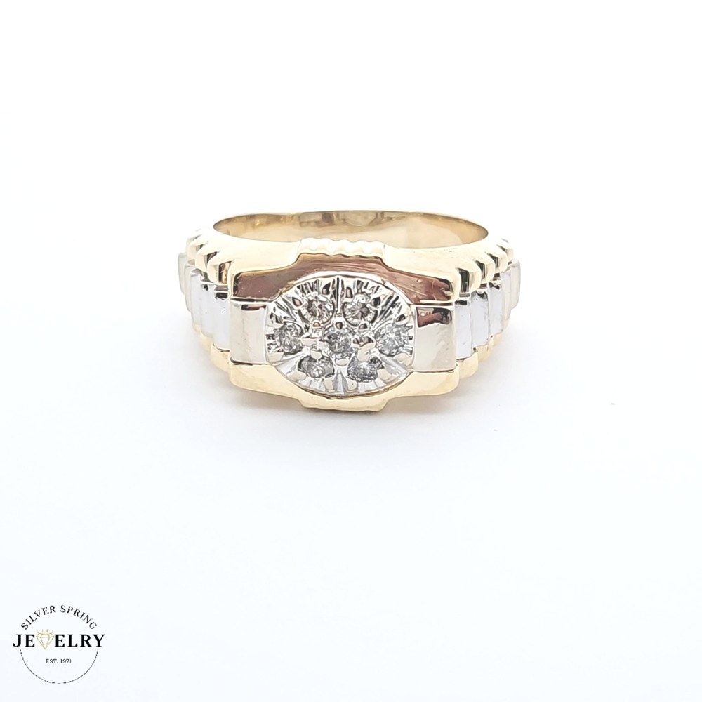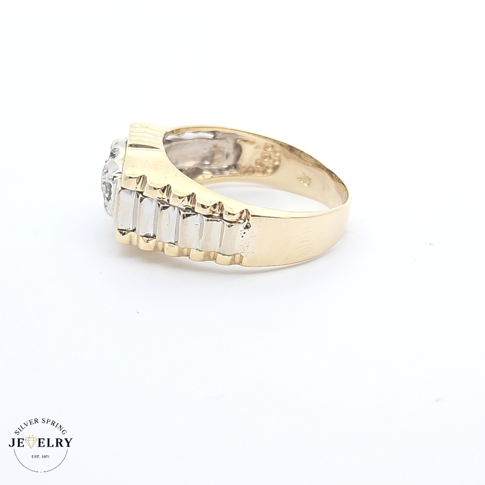 Presenting a men's Fancy Ring, weighing 9.90 grams and crafted from 14-carat two-tone gold fashioned in a unique Rolex style. The ring displays approximately 0.50 carats of sparkling diamonds for a touch of luxurious brilliance. This showstopper jewelry piece is available in size 11.5, making it a perfect statement piece for those seeking bold and sophisticated accessories. It combines classic elegance with modern luxury, offering a tasteful adornment for any occasion.