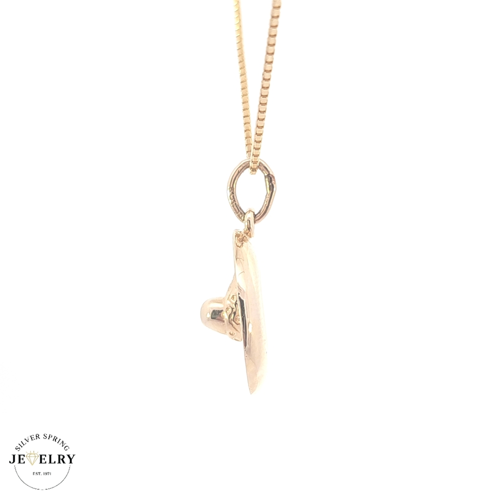 Presenting the extraordinary 14kt Mexican Hat, weighing 3.20 grams. This unique piece showcases impressive craftsmanship, featuring ornate detailing and a sleek finish. Measuring 16mm in diameter, it is the perfect size, easy to carry, and manage. This finely crafted hat is not just jewelry; it's an accurate depiction of culture and tradition. This piece adds a touch of enchanting Mexican heritage to your collection.