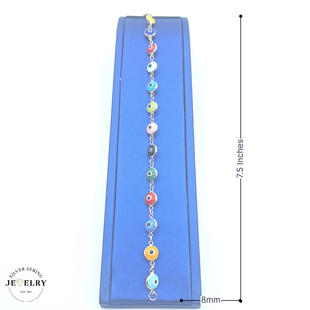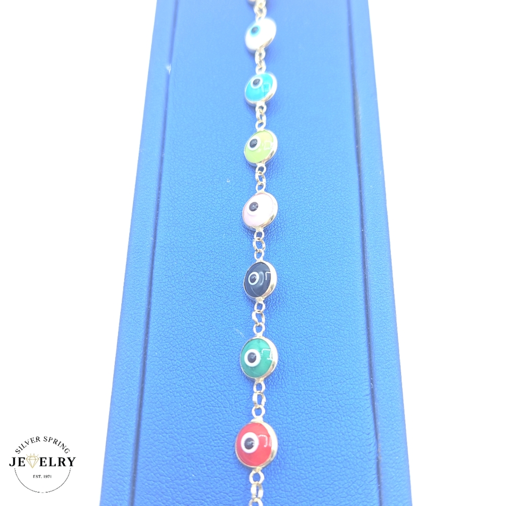 The Multicolor Evil Eye 14kt, with a weight of 5.5 grams, is a vibrant depiction of expert craftsmanship. The Evil Eye, a symbol of protection, is adorned with multicolored enamel a measures 8mm wide. This unique, precious piece is 7.5 inches in length, offering an exquisite fit for every wrist. Made from high-quality 14kt gold, it's a stunning blend of luxury and meaningful superstition, adding an elegant touch to any attire.
