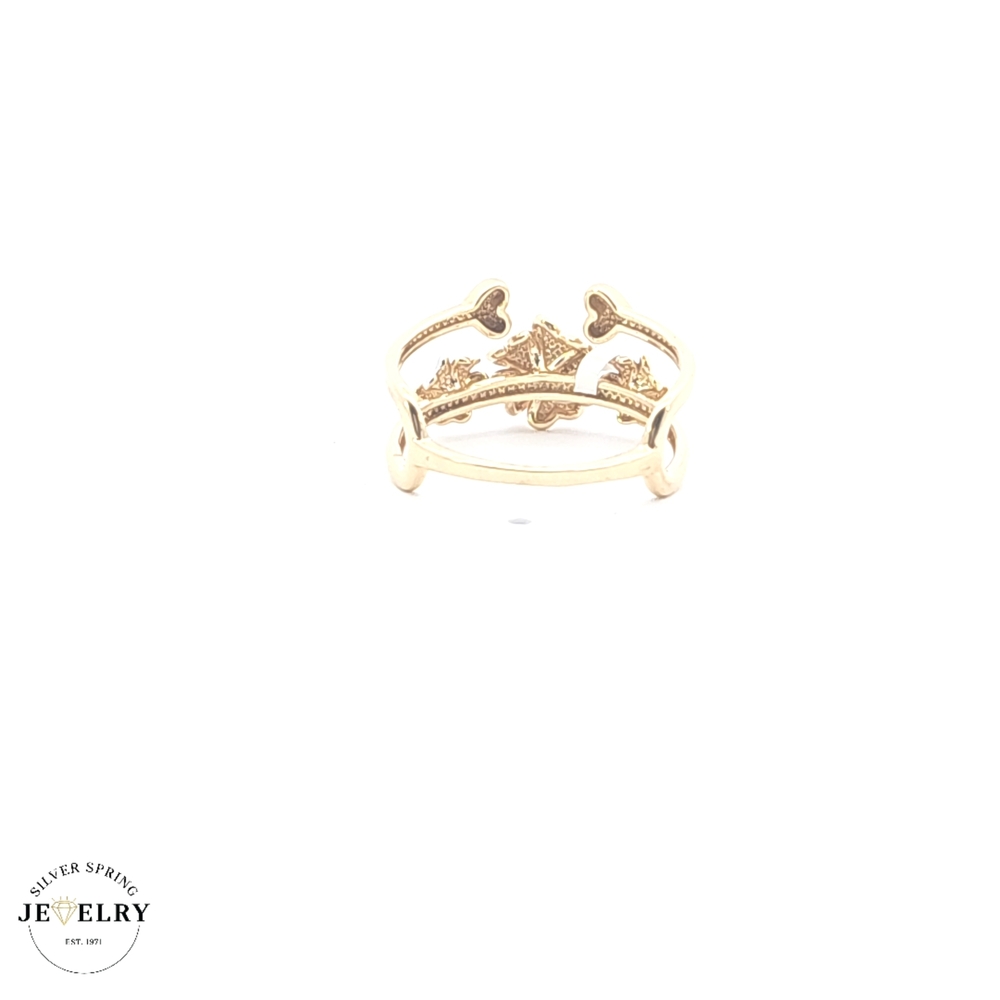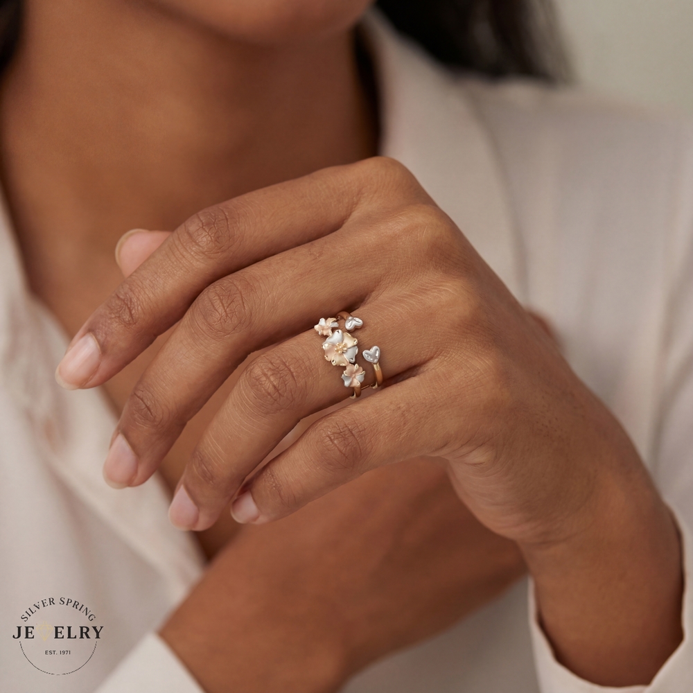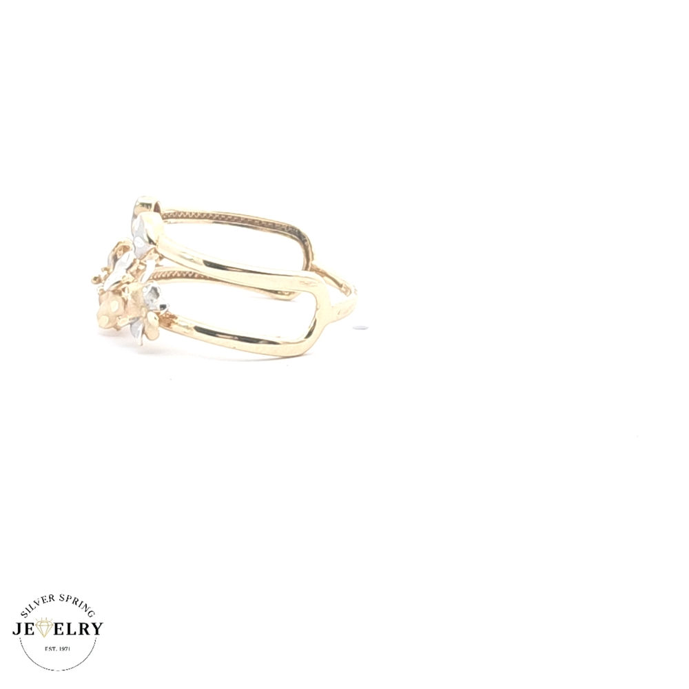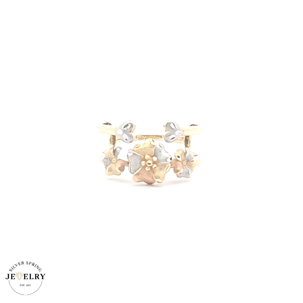 This beautiful Plumeria Flower Ring, crafted from 14kt tricolor gold, weighs 2.70 grams and is sized at 7.5. The ring features an intricate design of a plumeria flower, a symbol of beauty, charm, grace, and new beginnings. It's further embellished with high-quality zirconia stones, adding a touch of elegance. The unique tricolor gold gives it a distinct and appealing look, making it a perfect accessory for any outfit or occasion.