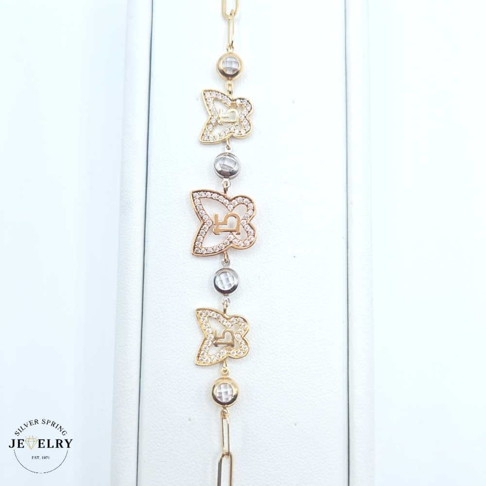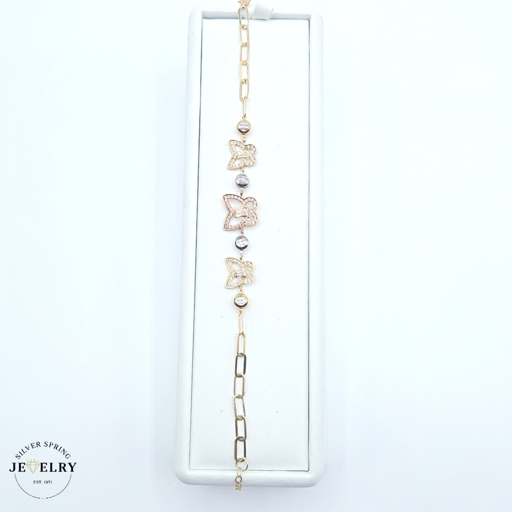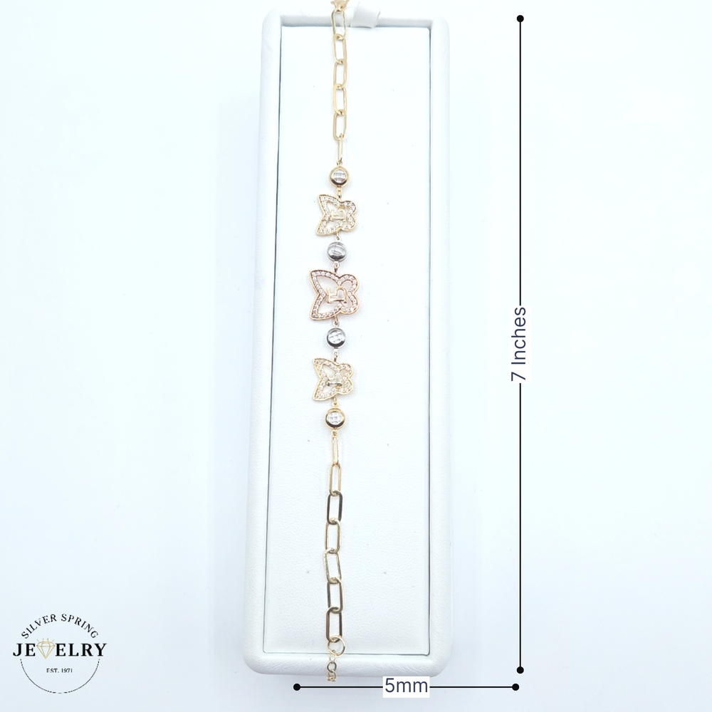 Celebrate your Quinceañera with this effortlessly chic, 14kt tricolor Butterfly Paper Clip Link Bracelet. Measuring 7 inches in length with a stylish 5mm width, this piece weighs 5.2 grams for a comfortable wear. Adorned with sparkling zirconia for added elegance, it offers the perfect balance of sophistication & femininity. Cherish the milestone of transition into womanhood with this timeless jewelry piece.