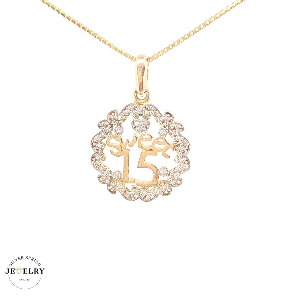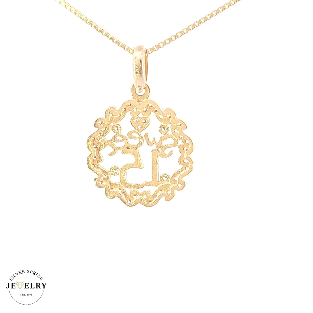 Celebrate your daughter's coming-of-age with our Quinceañera Heart Circle 14kt. This exquisite piece weighs about 2.30 grams and features a circle of hearts detailed with shimmering zirconia. At a diameter of 17mm, the heart circle is a delicate yet impactful piece of jewelry, a symbol of transition and growth for your young girl. Give her this timeless keepsake as a token of love and pride on her special day.