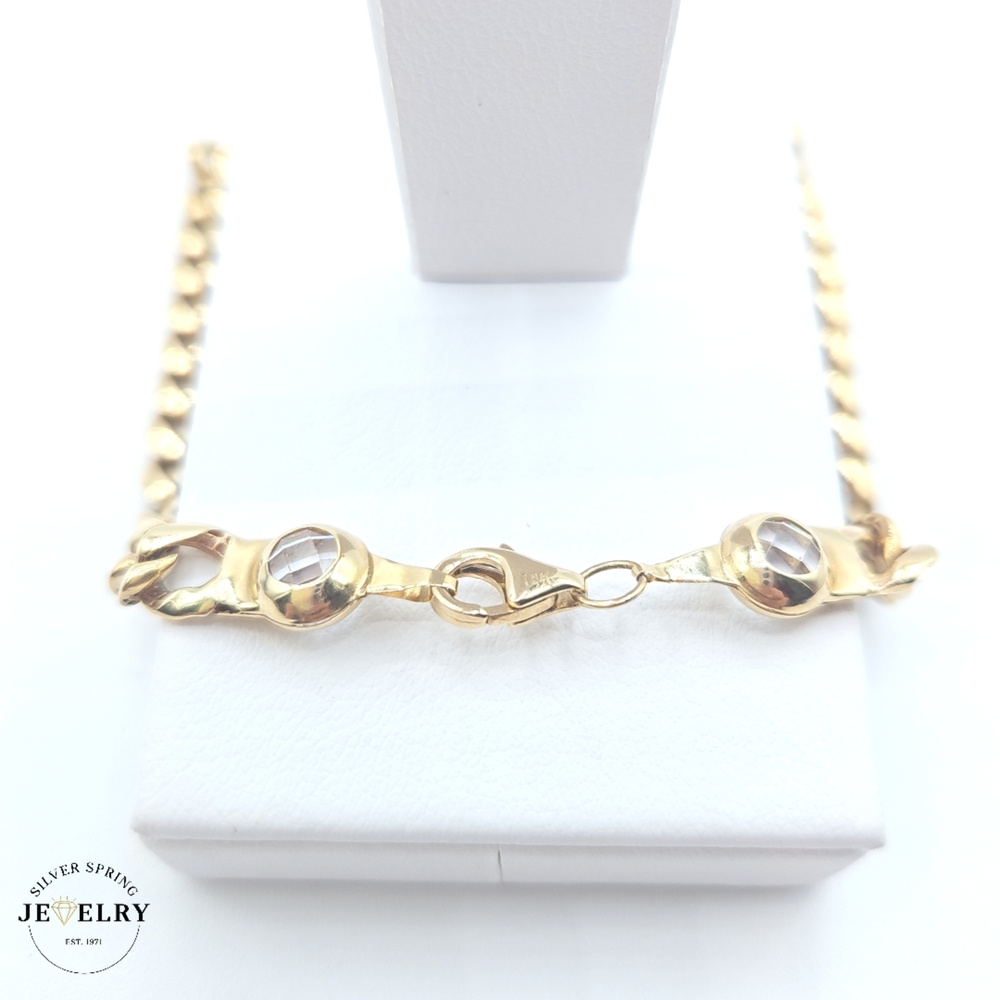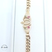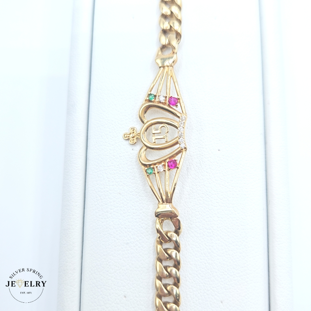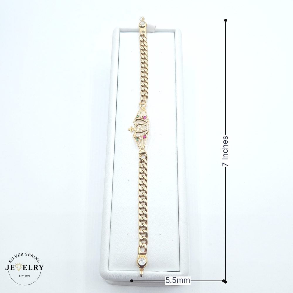 This exquisite Quinceañera Cuban Link Bracelet, crafted in 14kt gold, weighing 8.5 grams, stands out with its width of 5.5mm. It's just the right length at seven inches, tying it all together is a stunning crown centered attractively. Making it sparkle are zirconia stones, embedded carefully, showcasing a trio of vibrant colors - captivating green, breathtaking fuchsia, and classic clear, giving it an elegant touch. Make your special occasion extraordinary with this eye-catching piece.