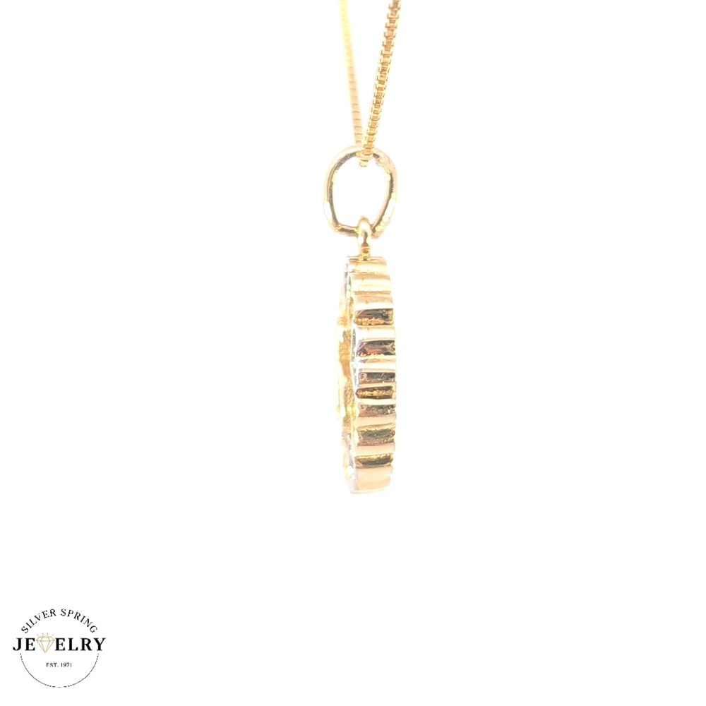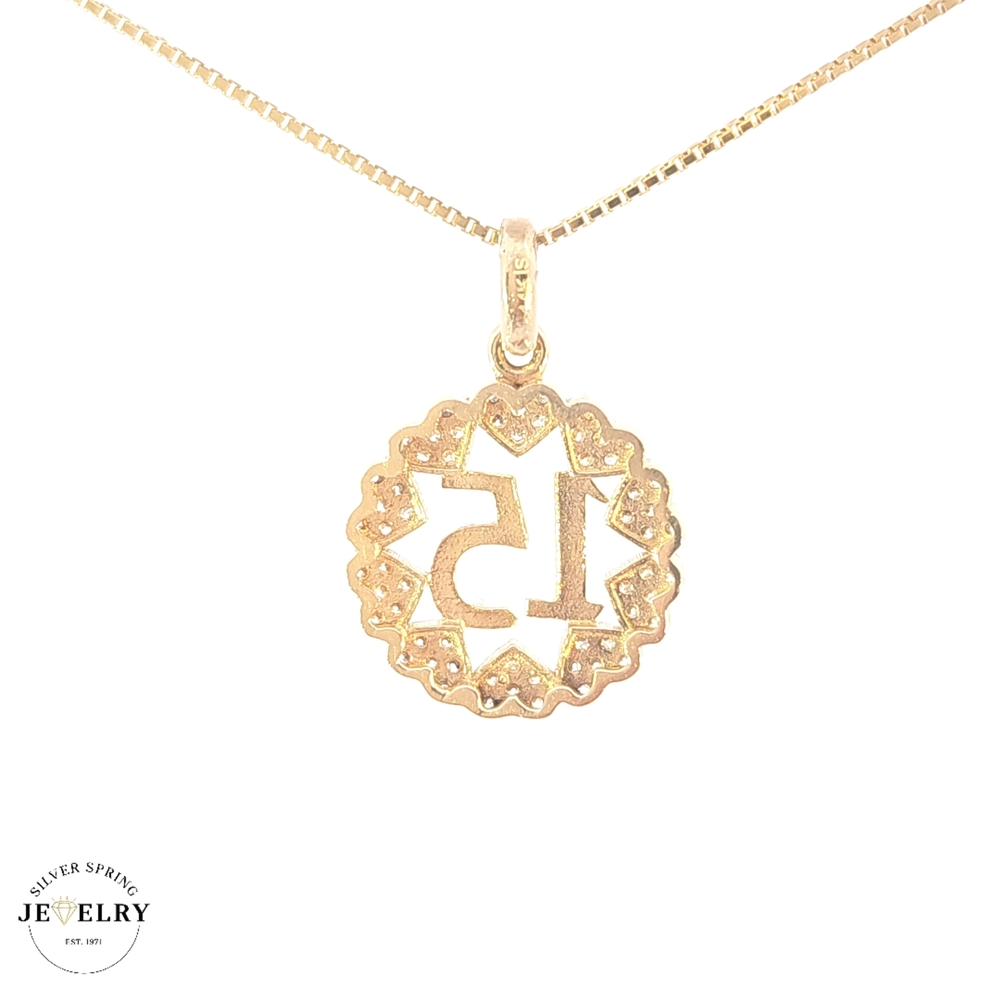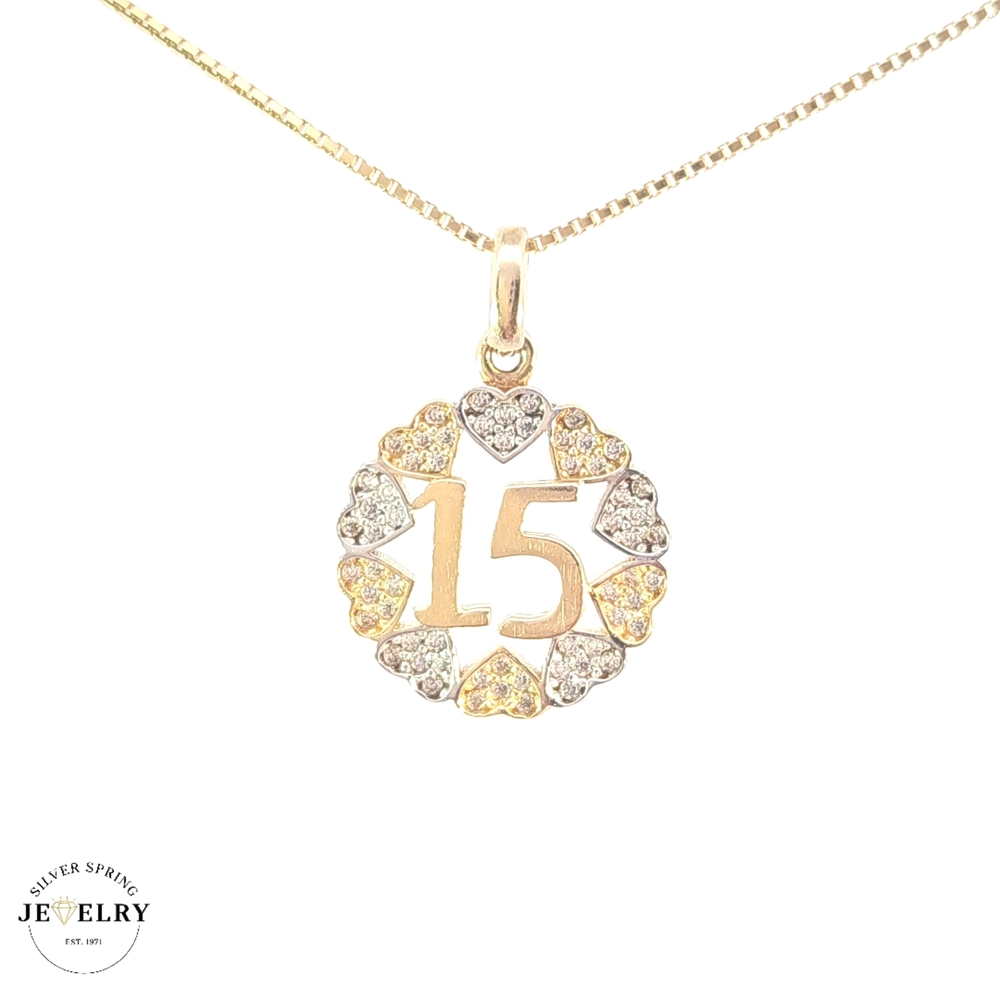 This Quinceañera Pendant is a distinct piece crafted from 14kt two-tone gold. Weighing 2.60 grams and having a 16mm diameter, it is not too heavy or large, making it a comfortable adornment. The pendant features a charming combination of hearts with zirconia, adding a sparkly touch. This accessory is perfect for celebrating a girl's special Quinceañera event, symbolizing her transition into womanhood.