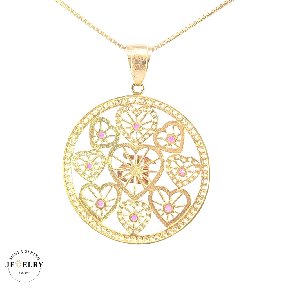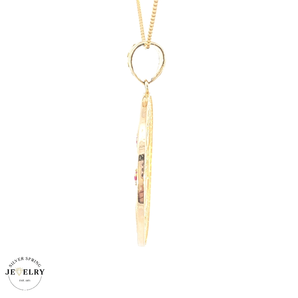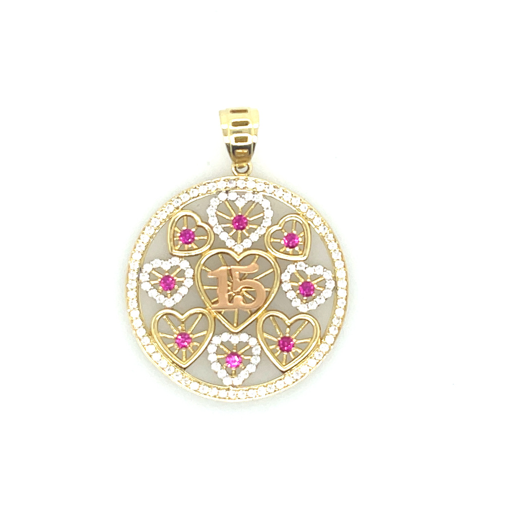Celebrate the Quinceañera milestone with this beautiful two-tone pendant made from 14kt gold and weighing a substantial 4.90 grams. Featuring an eye-catching 29mm diameter circle design, it's adorned with fuchsia zirconia that adds a pop of color and sparkle. It's not just a piece of jewelry, but a token of love, growth, and transition to adulthood. A heartfelt gift that perfectly symbolizes the traditional family values at the heart of Quinceañera.