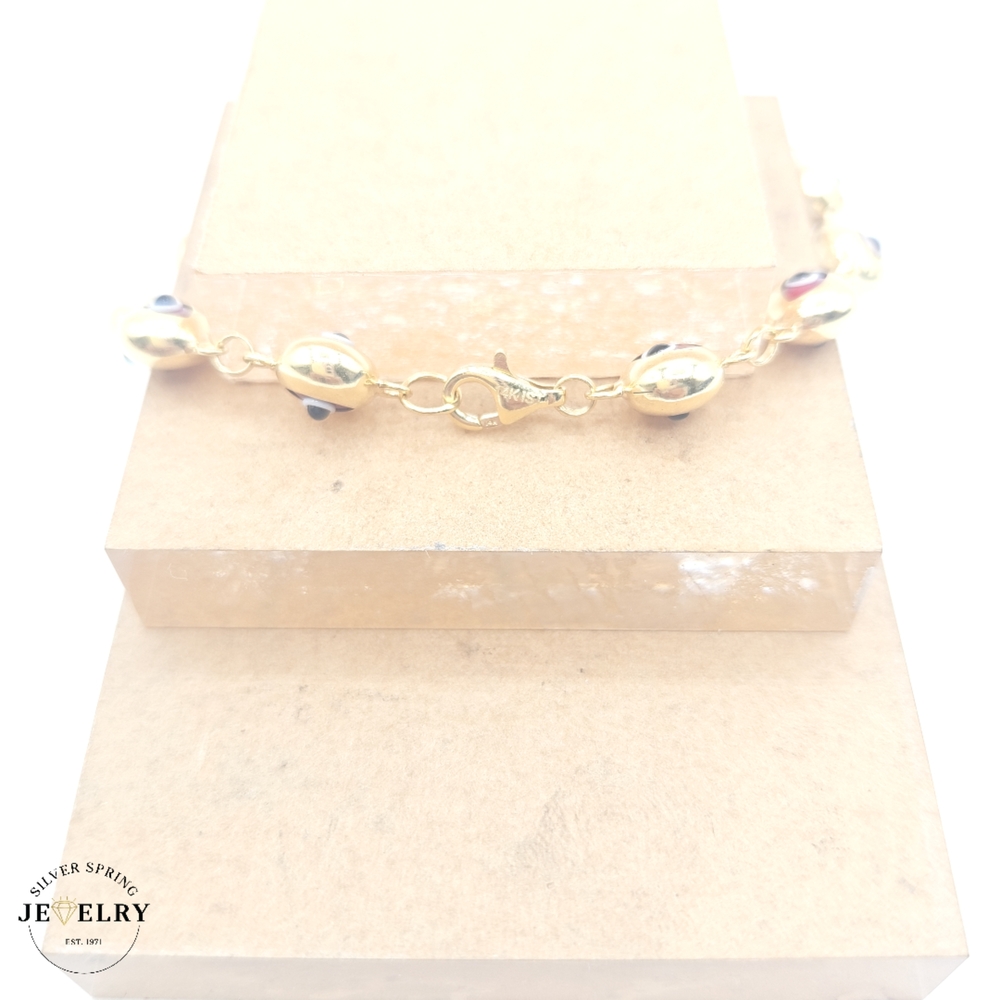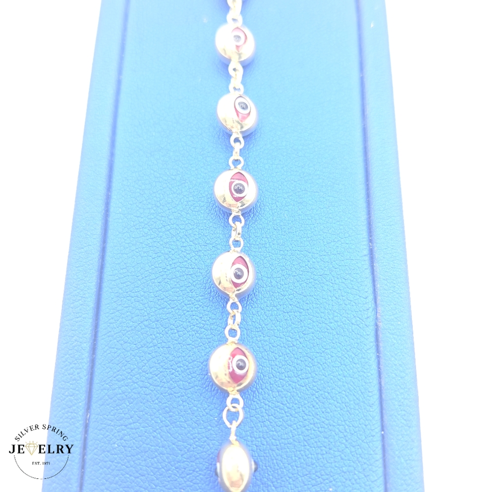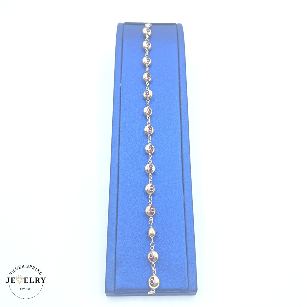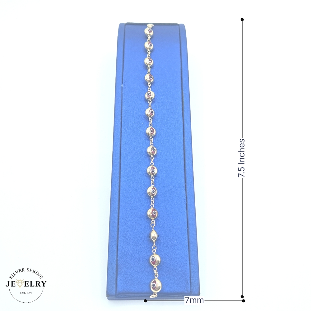 Our Red Evil Eye Bracelet, crafted from pure 14kt gold, exudes a captivating appeal. The focal point is its striking red evil eye, known for warding off negative energy. The bracelet boasts a width of 7mm, striking the perfect balance between dominance and subtlety. It measures 7.5 inches, making it a suitable size for a variety of wrist sizes. This piece is both aesthetically pleasing and deeply meaningful, making it an exceptional gift or addition to your own jewelry collection.