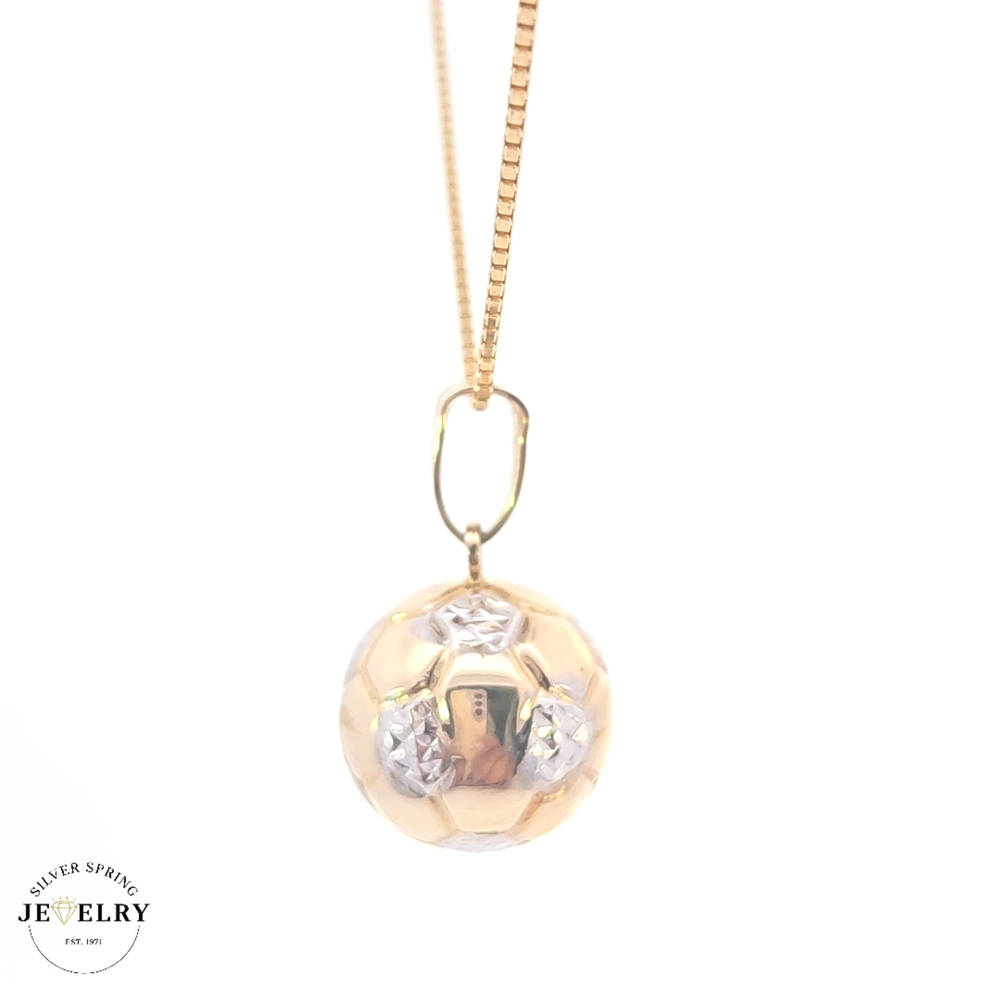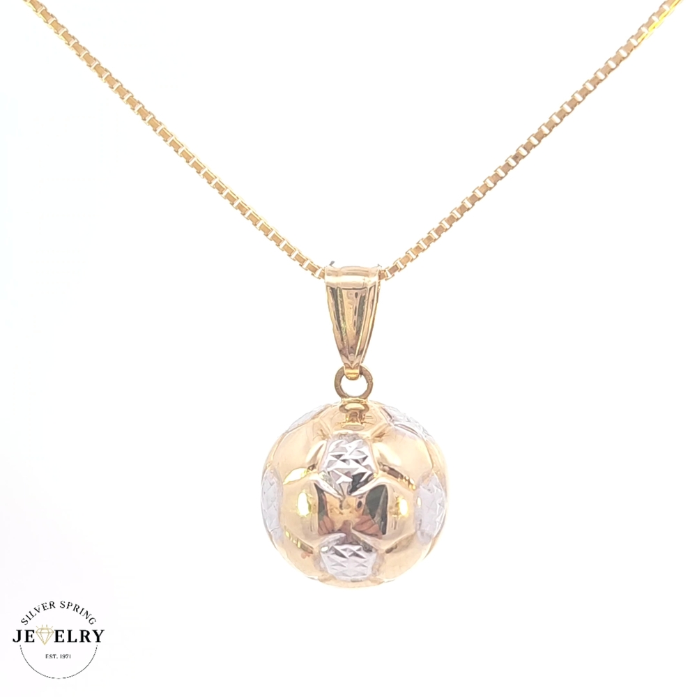 Showcase your passion for soccer with this stunning 14kt two-tone soccer ball charm. Weighing 1.60 grams, it offers a sturdy presence without weighing you down. The piece features a diameter of 12.5mm, making it an eye-catching addition to any ensemble. Meticulously crafted to capture the intricate details of a soccer ball, it boasts a combination of polished and textured finishes, enhancing its realistic design.