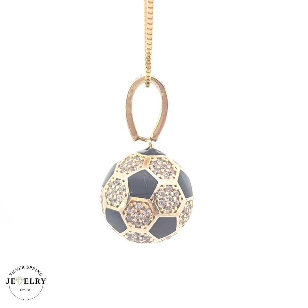 Adorn yourself with this luxurious 14kt 4.80 gram soccer ball charm. Meticulously crafted with precision, it features a diameter of 14mm, ensuring the perfect size to grace any accessory. Encrusted with sparkling zirconia for a brilliant shine that complements the gold. A stunning piece that celebrates the beautiful game and adds an elegant touch to your style. Make a dazzling statement with this stylish soccer ball charm.