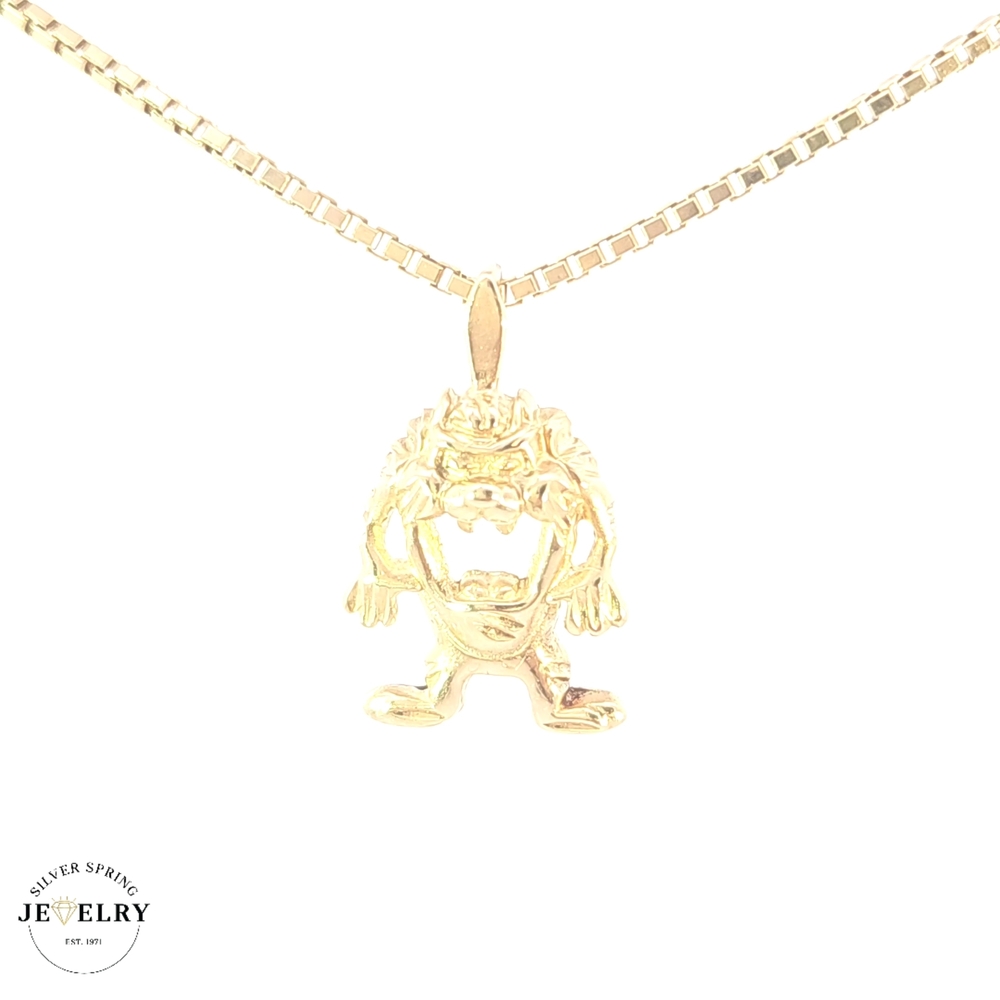 Presenting a Tasmanian Devil emblem made of 14kt gold, weighing 1.80 grams. The piece showcases exquisite craftsmanship, measuring 12mm wide a 0.75 inches long. This unique symbol of the iconic Tasmanian Devil makes it an ideal piece for collectors and enthusiasts alike. Made from durable, high-quality gold, this piece ensures longevity while providing a distinct charm to your collection.