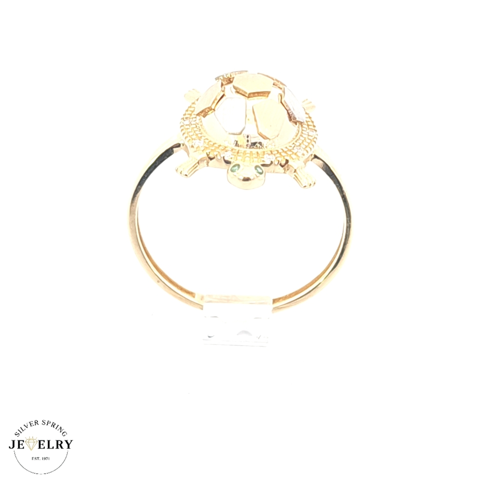 Presenting a charming Turtle Ring, carefully crafted in 14kt tricolor gold, weighing 2 grams. This unique ring sparkles with refined zirconia accents, adding a delightful sparkle to its design. With its universal size 8 fitting, it promises to be a comfortable wear. Modestly dazzling and exquisitely designed, this Tricolor Turtle Ring perfectly combines style and symbolism, making it an eye-catching addition to any jewelry collection.